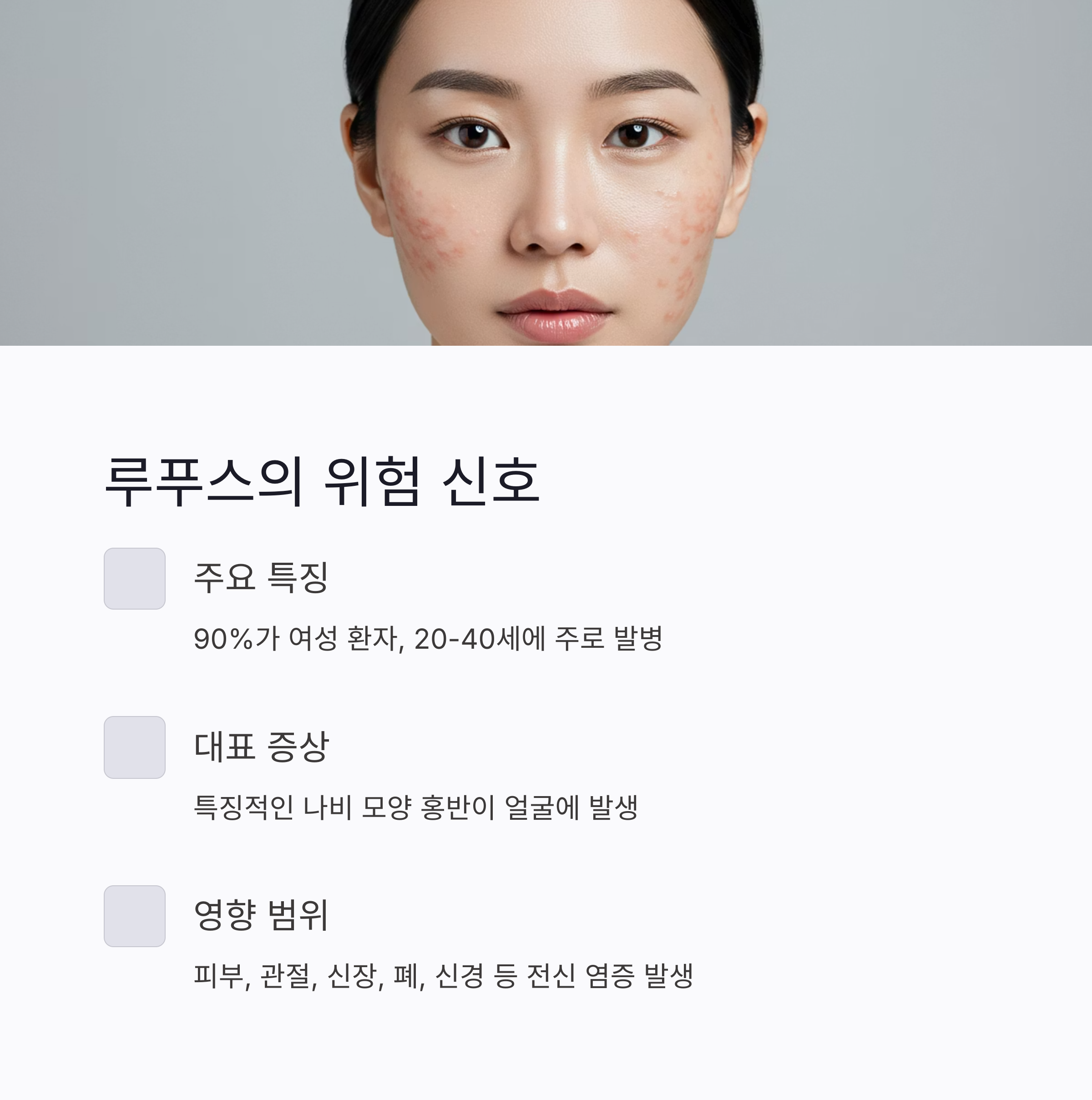 나비 모양의 얼굴 발진, 피로감, 관절통, 발열 등이 특징이며