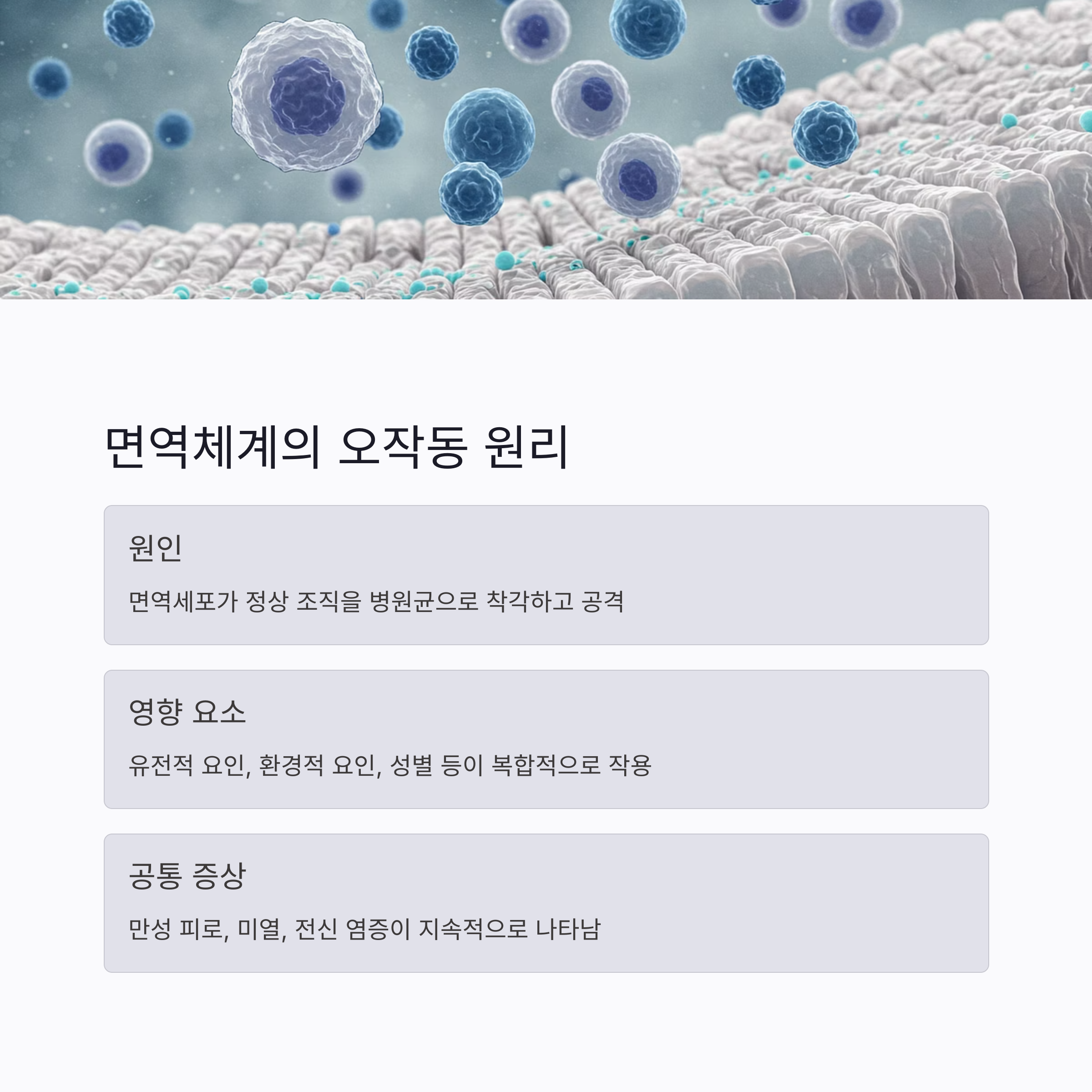 자가면역질환은 면역체계가 자신의 세포를 공격하는 질환입니다.
