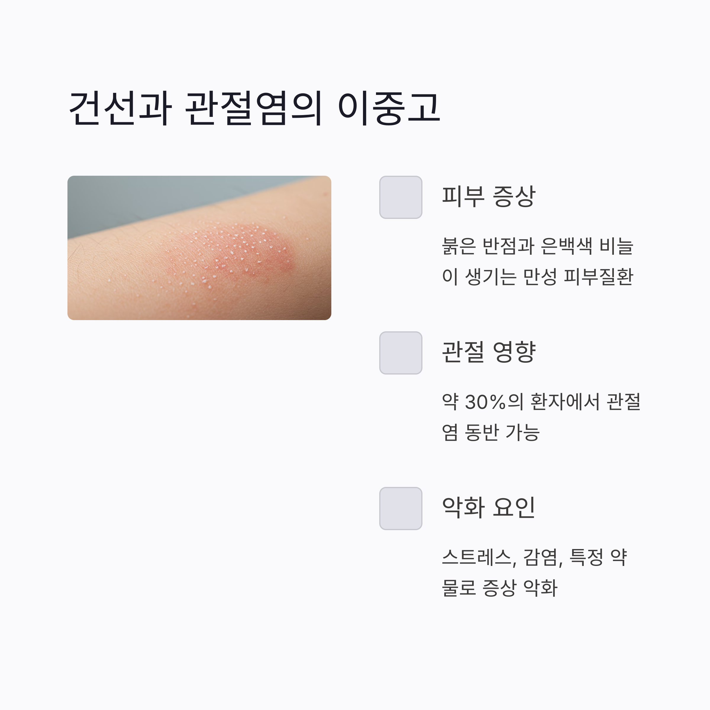 관절 통증과 함께라면 건선성 관절염도 의심해볼 수 있습니다.