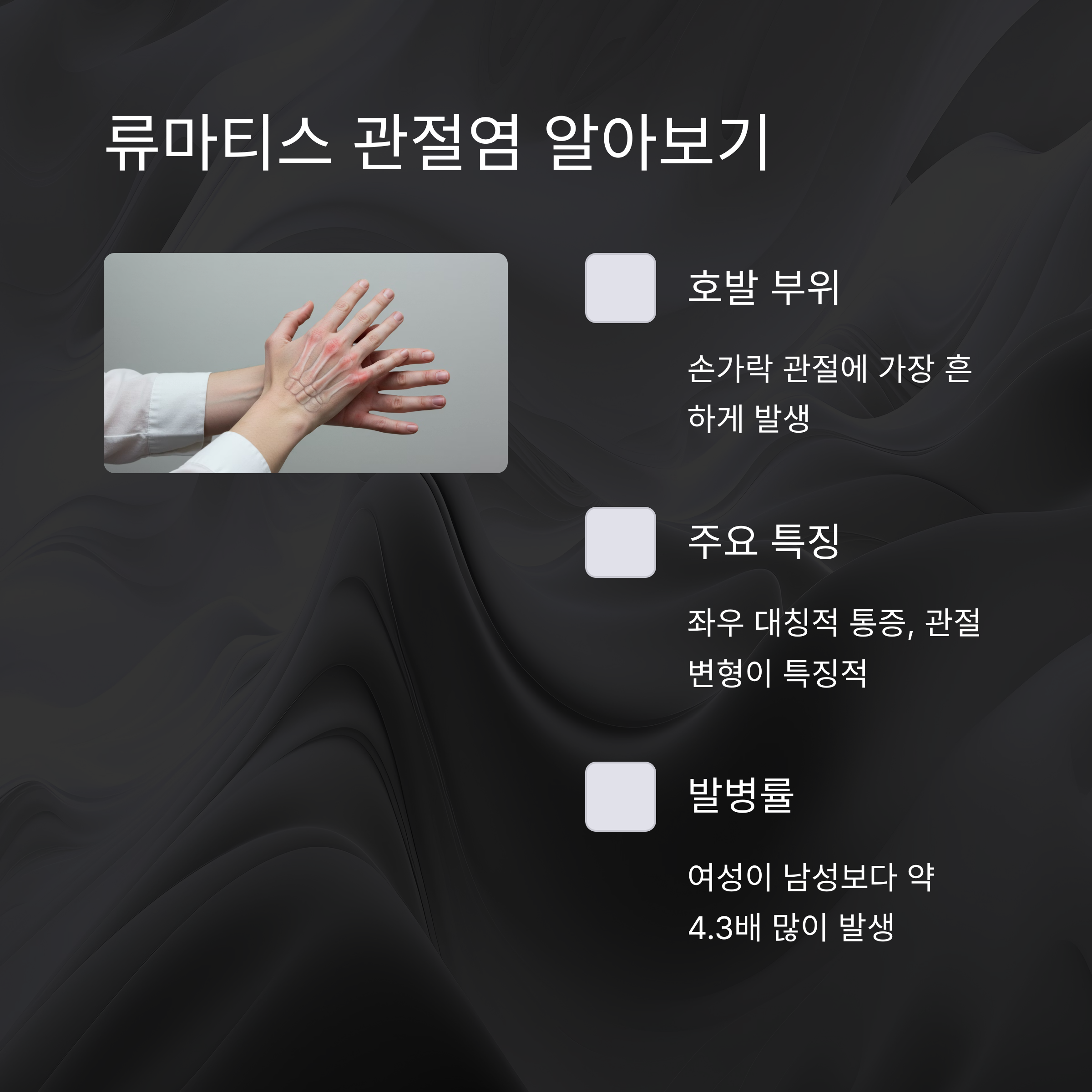 류마티스 관절염은 관절을 중심으로 염증이 발생하는 질환입니다.