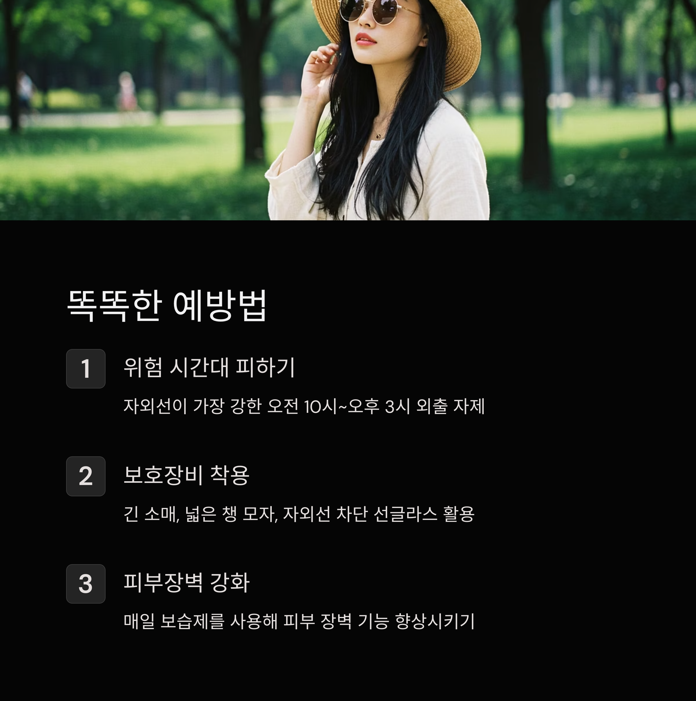 - 긴 소매, 모자, 선글라스로 물리적 차단
