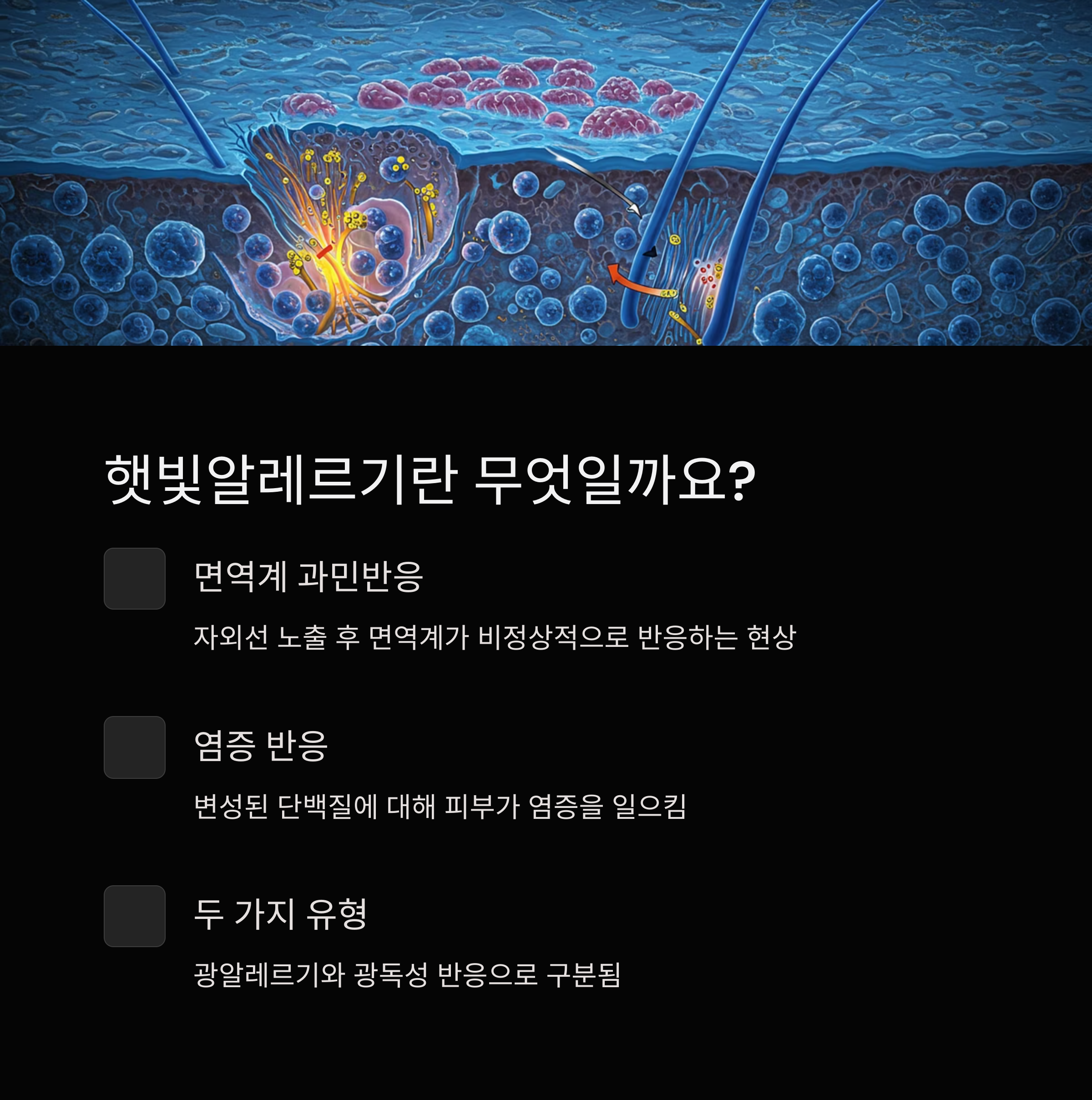 햇빛알레르기는 자외선에 노출된 후 피부가 과민 반응을 보이는 질환입니다.
