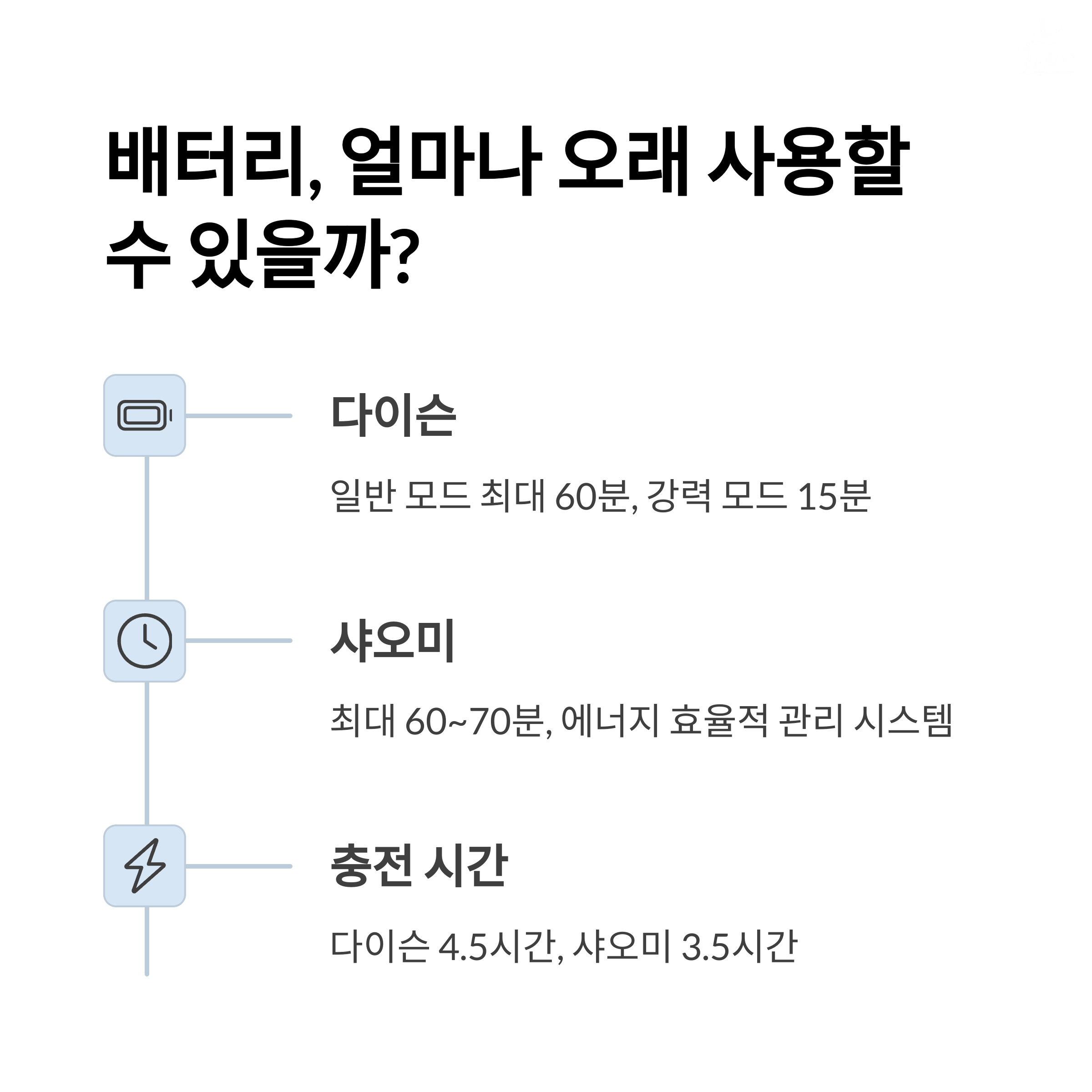 다이슨은 흡입력이 높아도 일정한 출력을 오래 유지합니다.