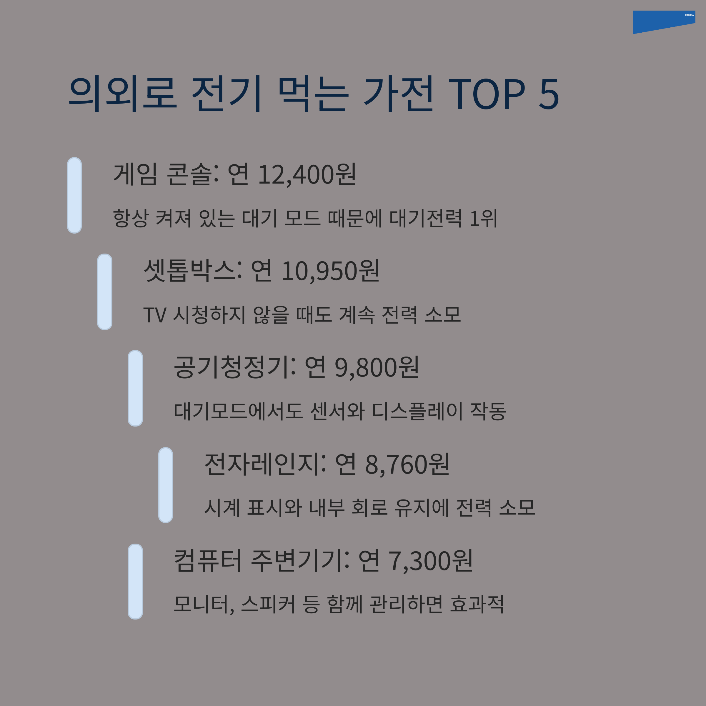 예: 셋톱박스 1대의 대기전력만 해도 연간 약 5천 원 이상이 낭비됩니다.
