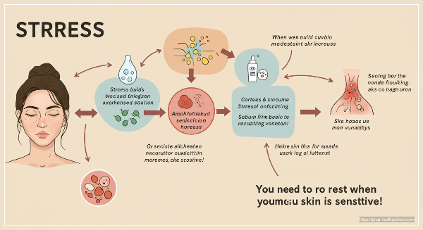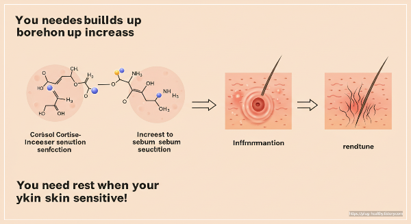 스트레스가 쌓이면 코르티솔(스트레스 호르몬)이 증가하면서 피지 분비가 많아지고, 염증이 악화될 수 있어요.
