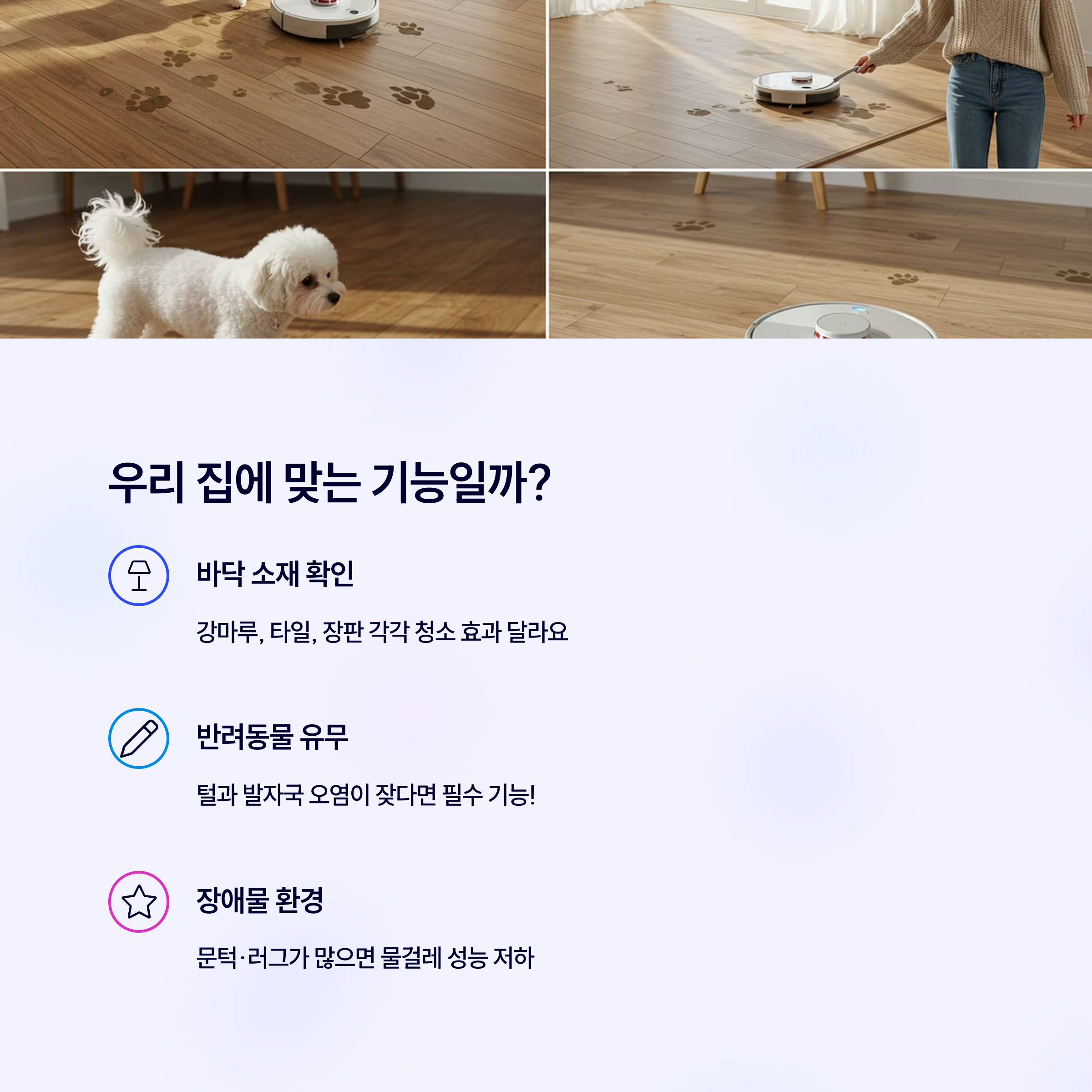 - 바닥이 대부분 마루, 장판, 타일일 경우 물걸레 기능 적합