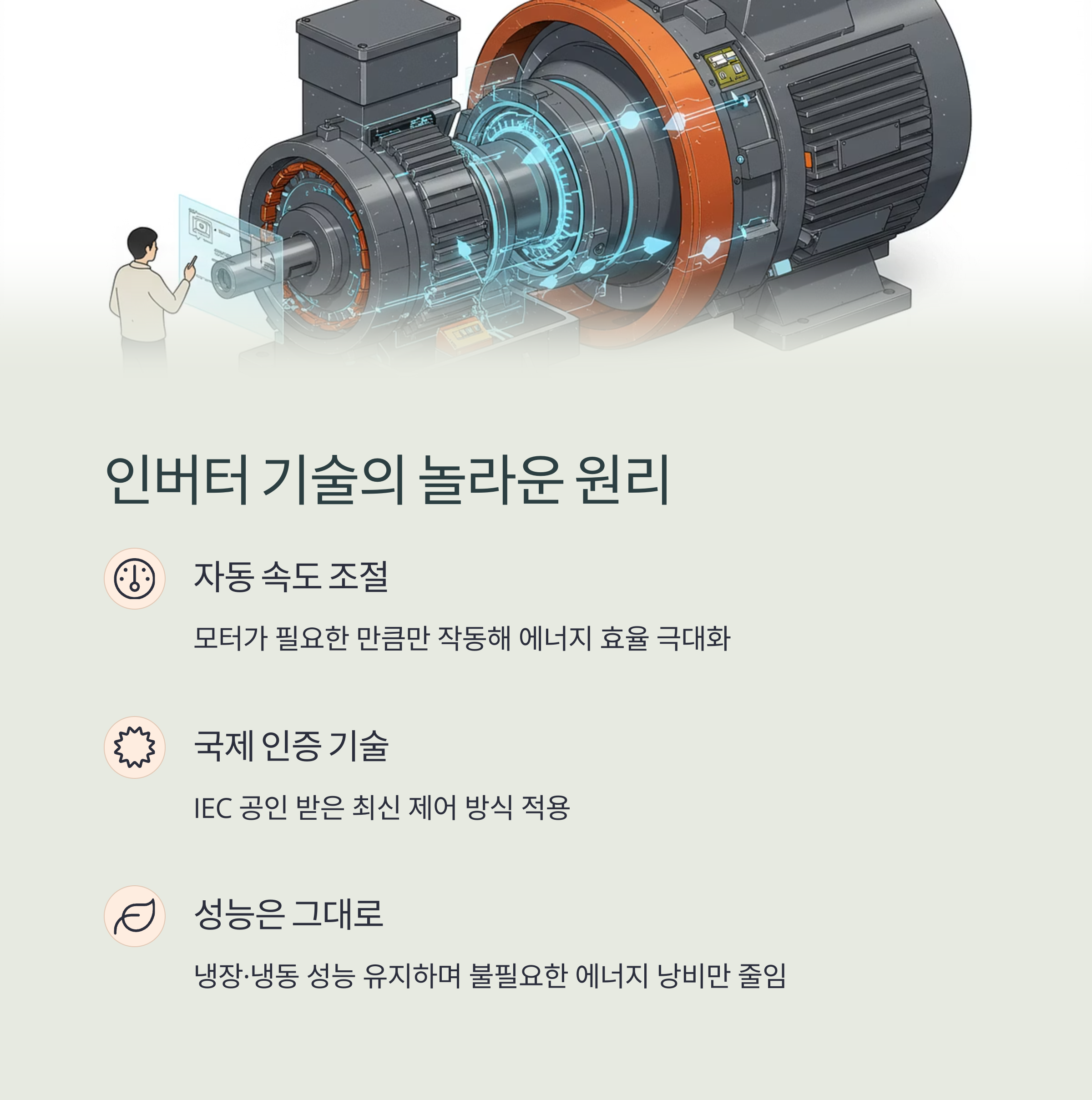 인버터는 모터의 회전 속도를 상황에 맞게 조절하는 기술입니다.