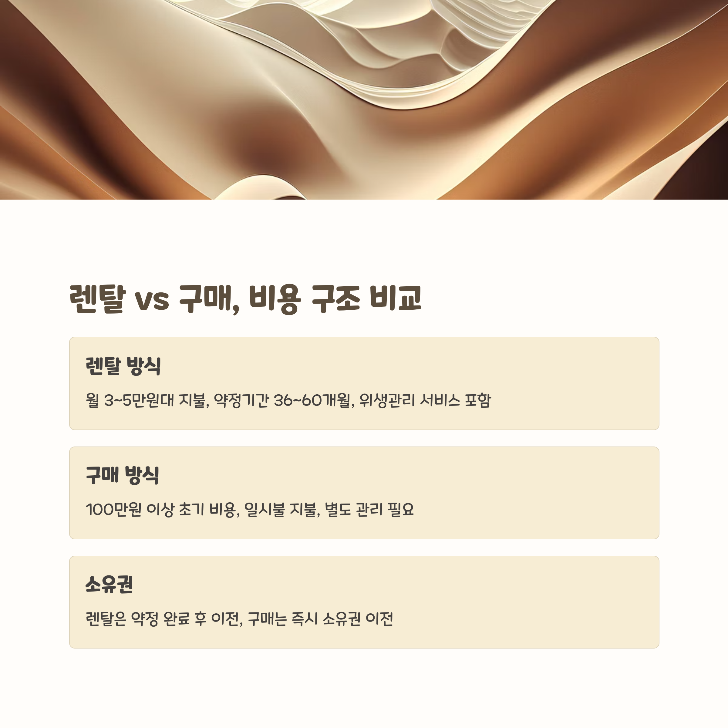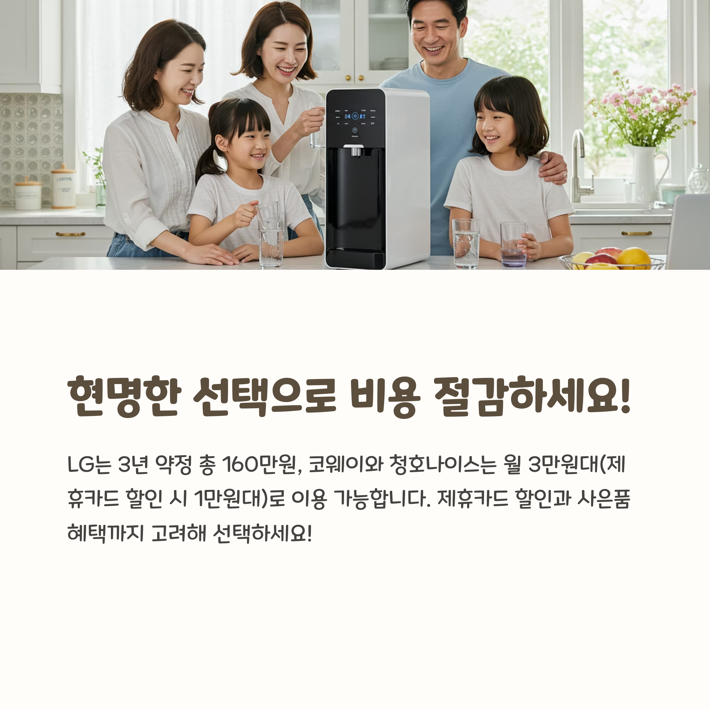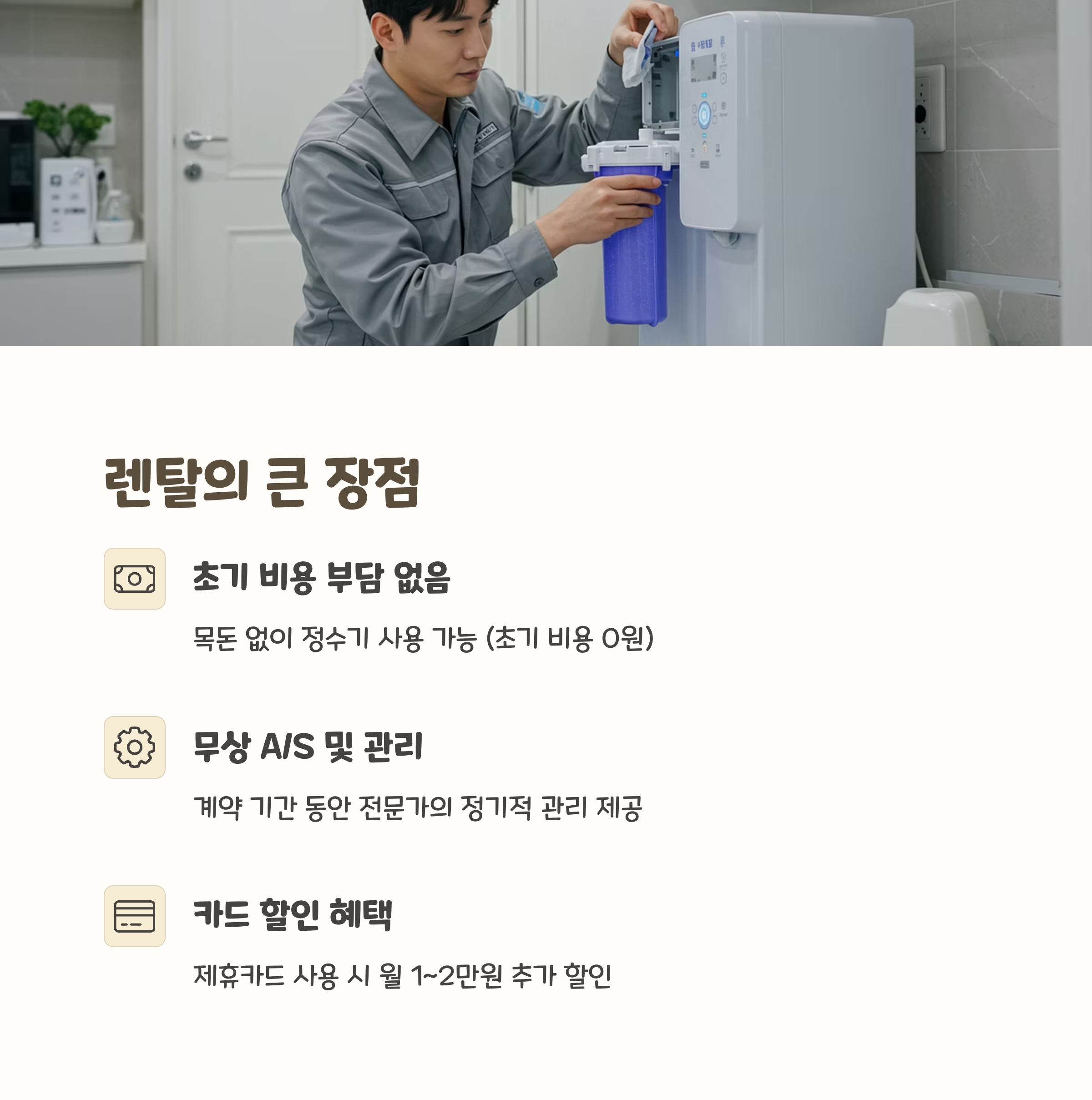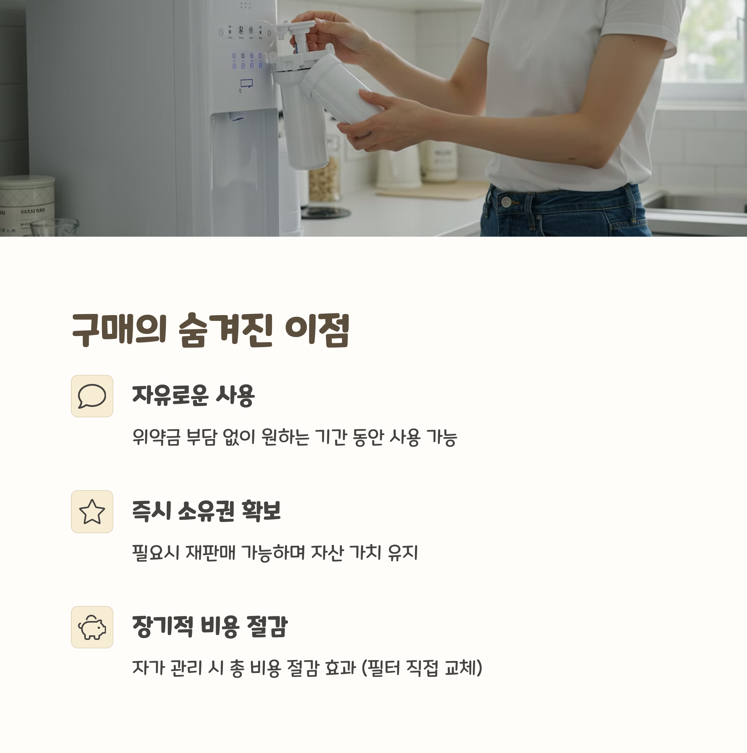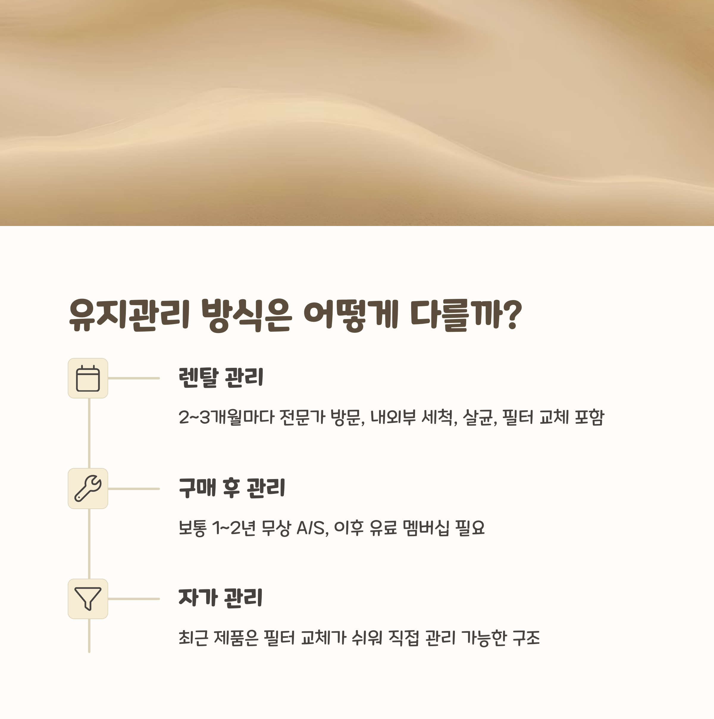 - 렌탈: 필터 교체, 점검, A/S 전부 포함되어 있어 관리 부담 없음