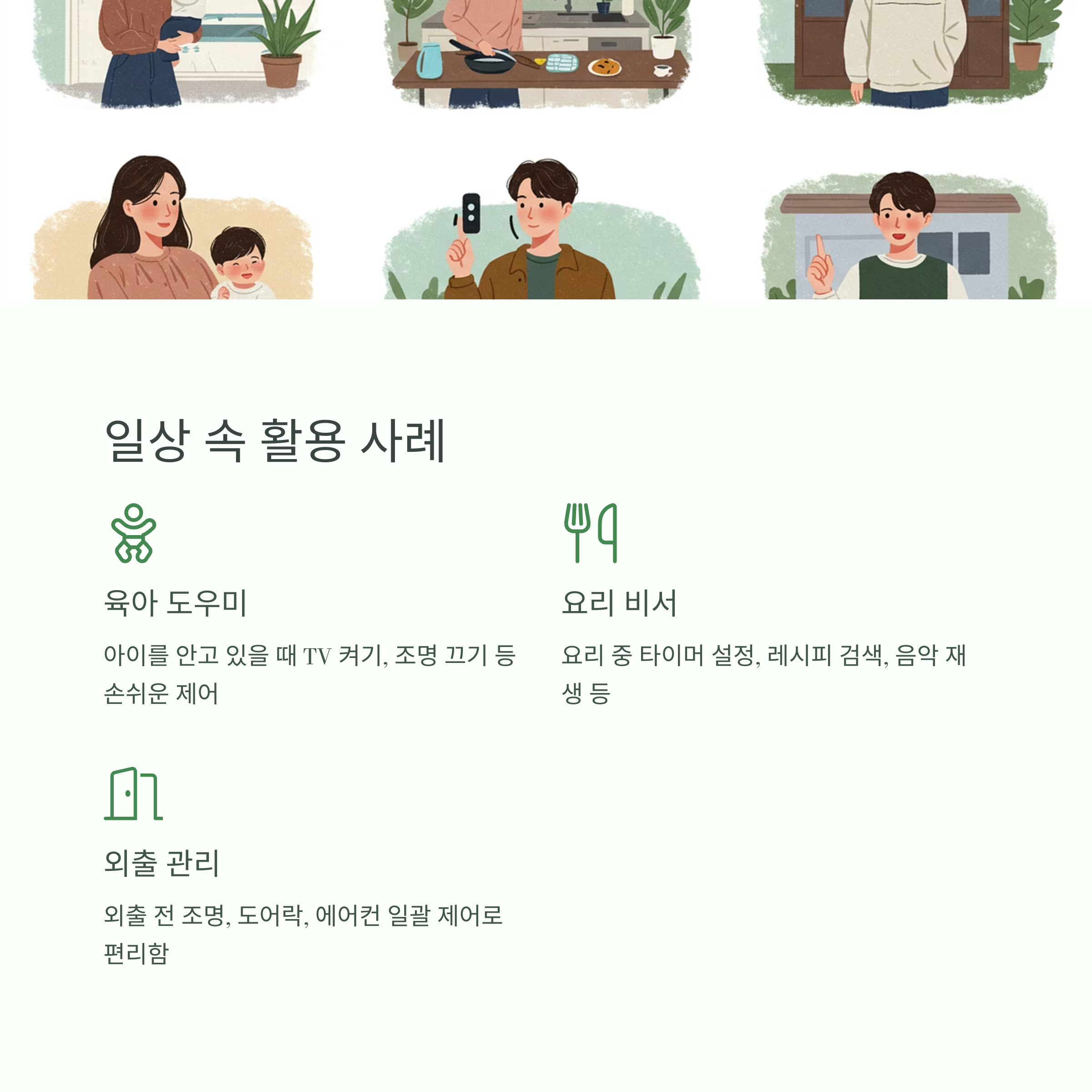 - 귀가 시: “거실 불 켜줘”, “TV 켜줘”로 환영 분위기 연출