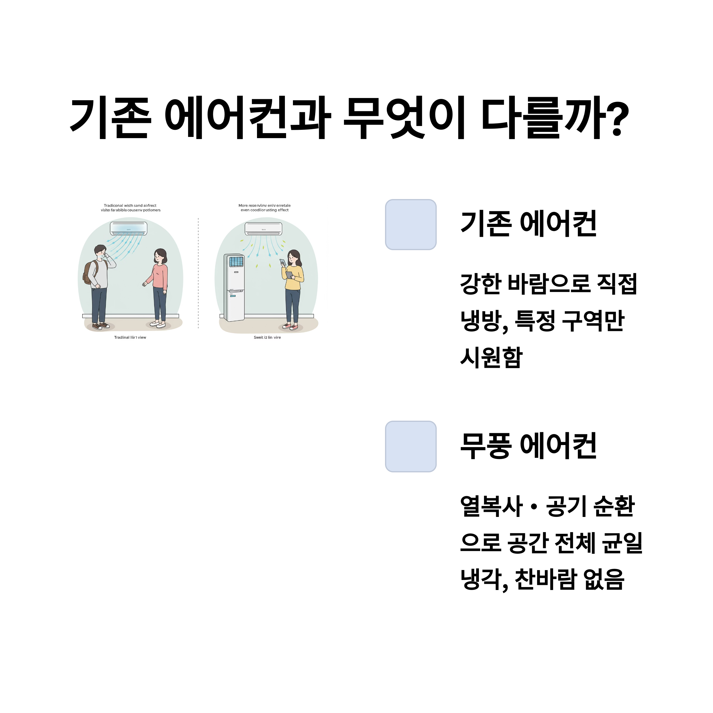 무풍 에어컨은 실내 전체 온도를 균일하게 낮추는 방식입니다