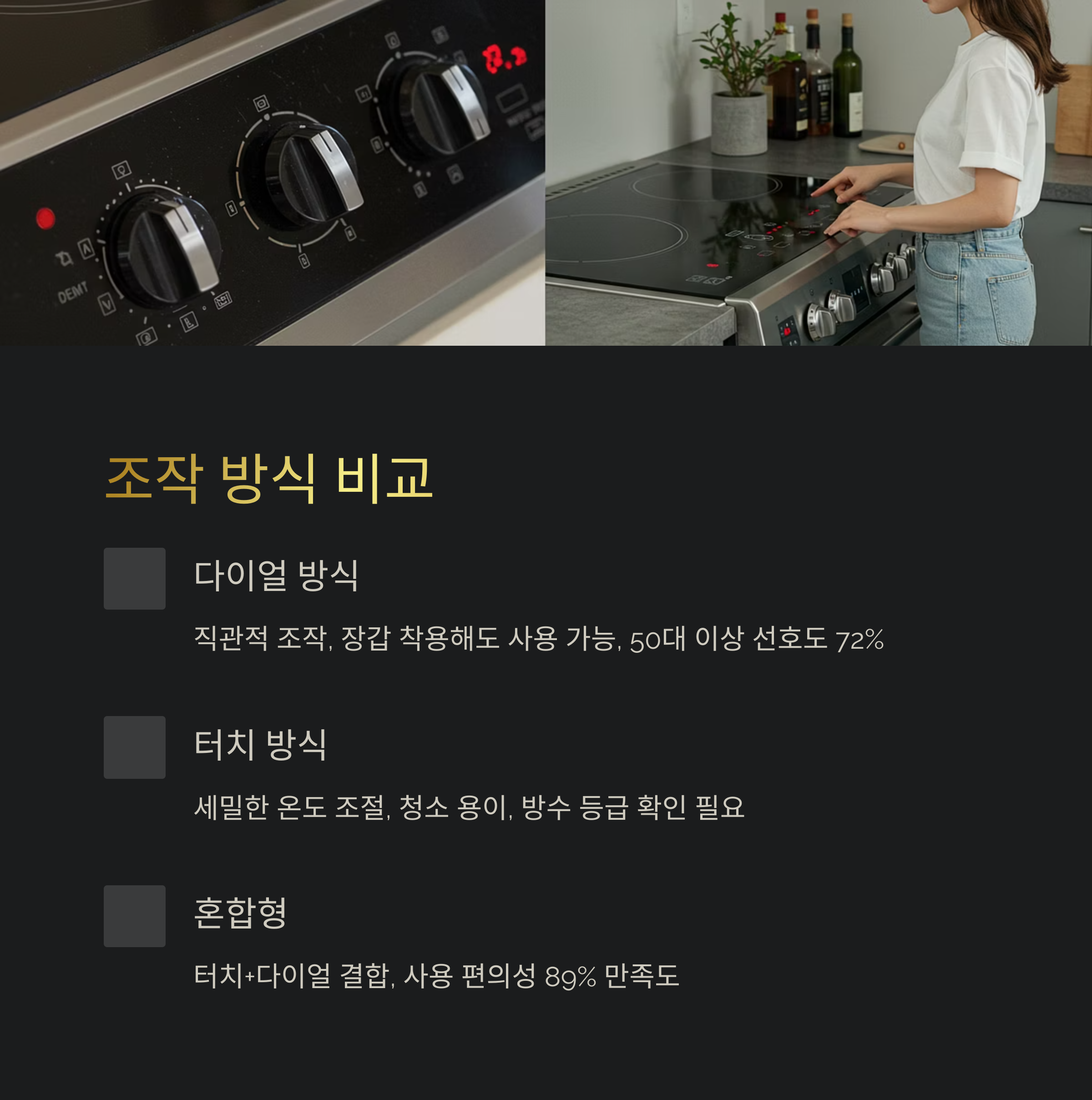 조작은 다이얼 방식과 터치 방식으로 나뉘며 사용 편의성에 큰 차이를 줍니다.