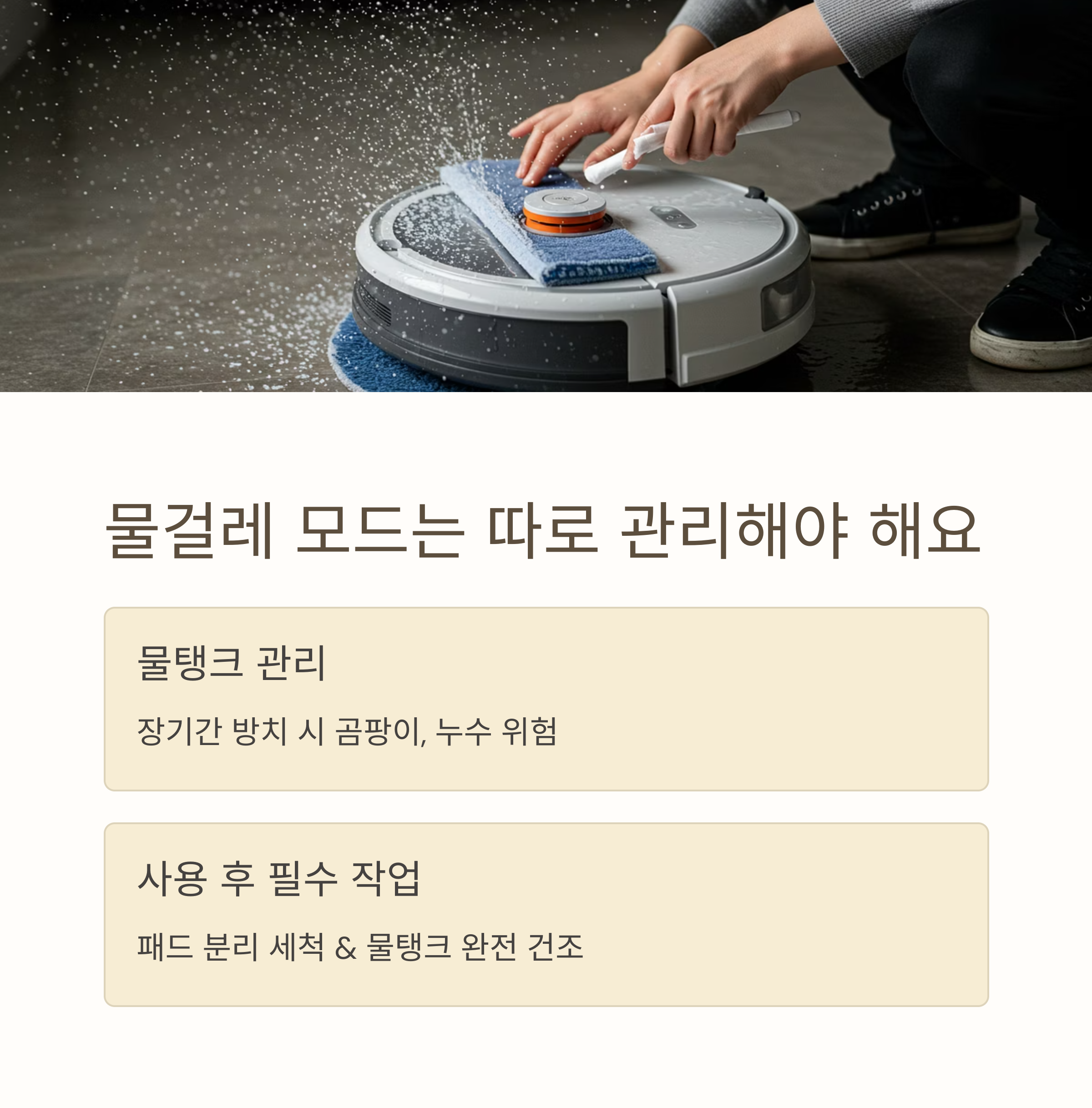 물걸레 기능이 있는 모델은 물탱크를 자주 세척하고, 사용 후에는 반드시 비워야 합니다.