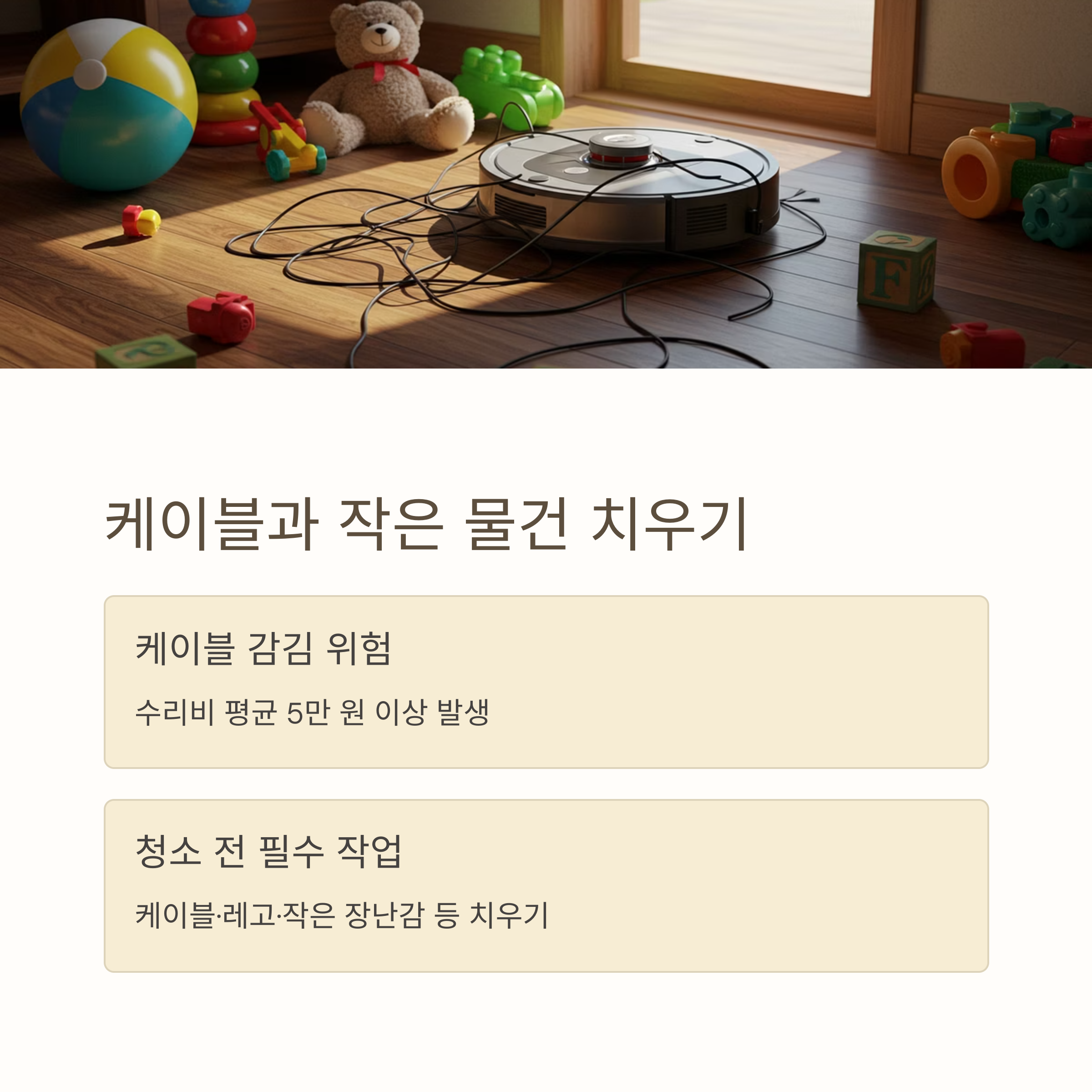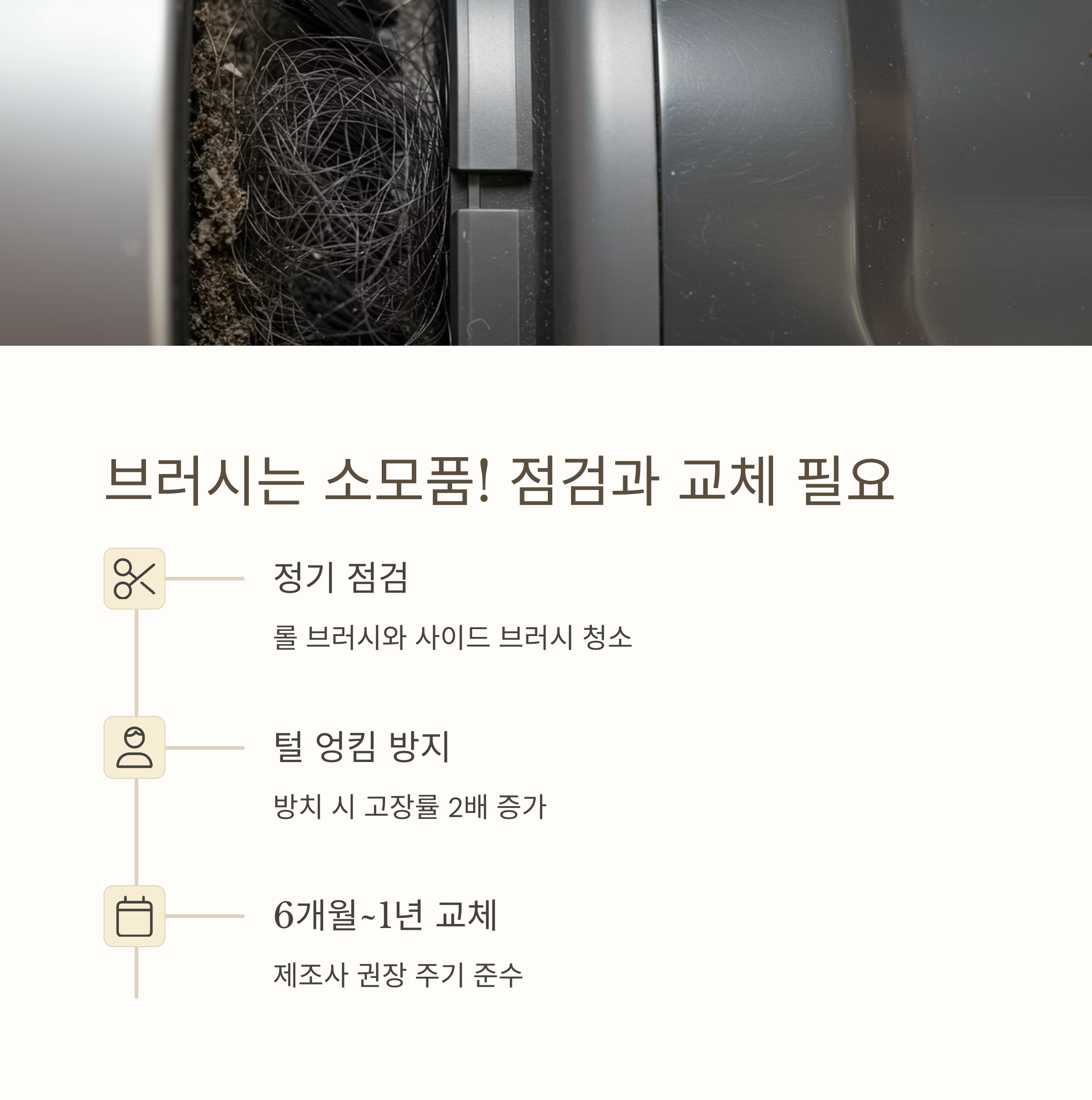 한 번 엉키면 브러시 고장, 바퀴 정지, 내부 모터 과부하까지 이어질 수 있어요.