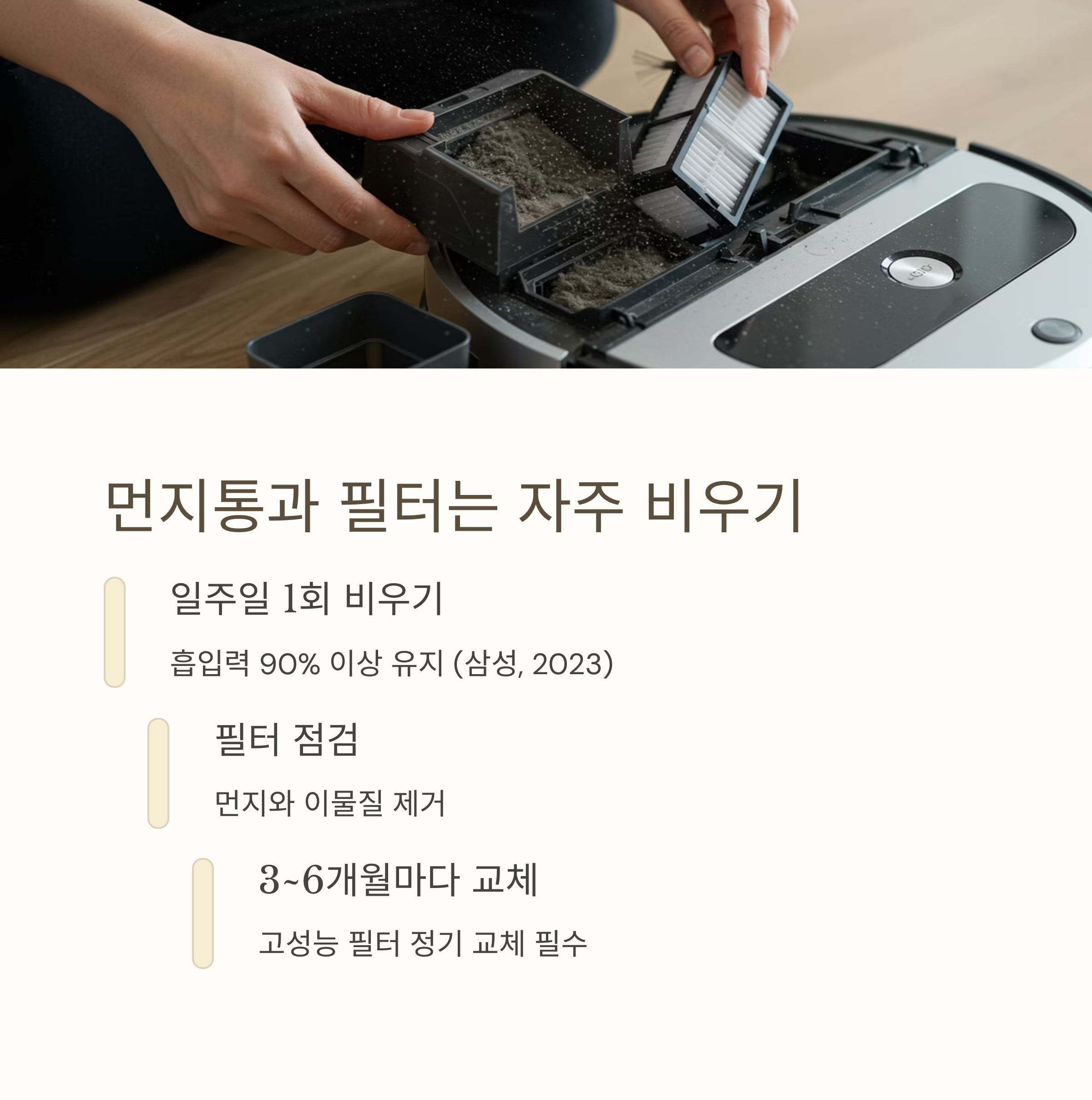 먼지통이 꽉 차면 흡입력이 급격히 떨어지고, 필터까지 막히면 모터에 무리가 갑니다.