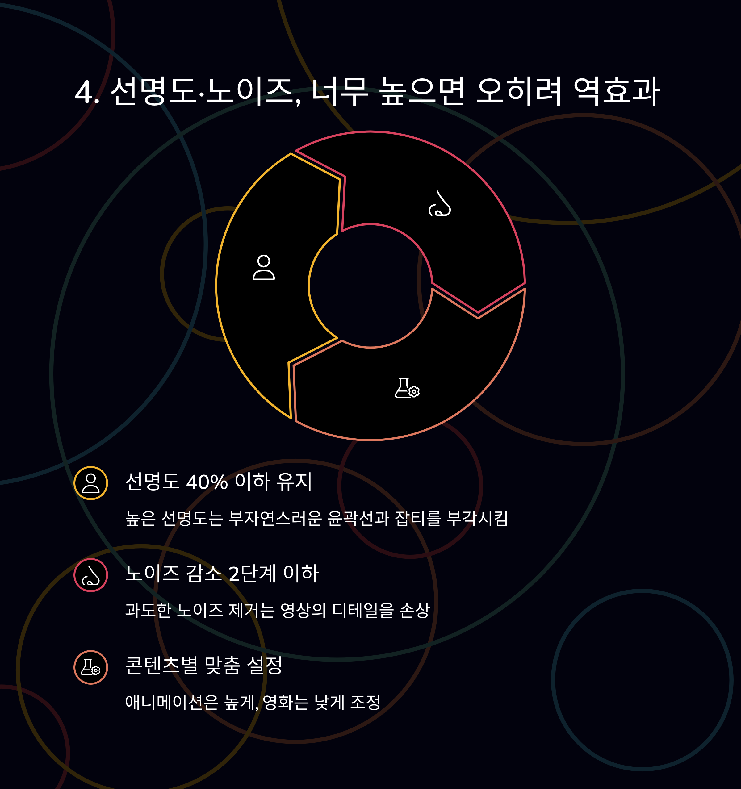 특히 4K 이상 해상도 영상에서는 이 기능들을 줄이는 게 오히려 더 선명해집니다.