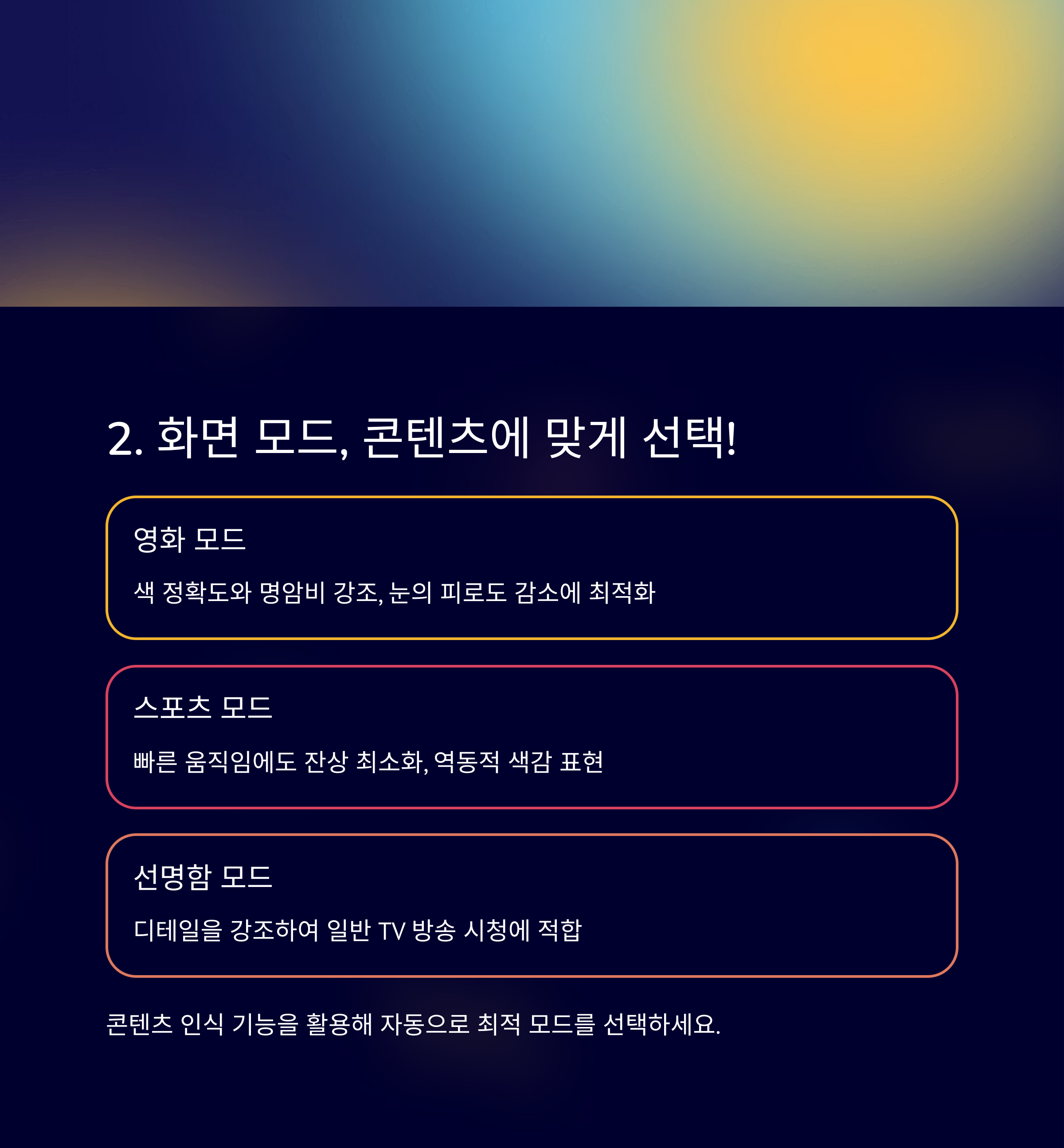 자신의 콘텐츠 소비 스타일에 맞게 모드를 바꾸는 것만으로도 체감 화질이 달라집니다.