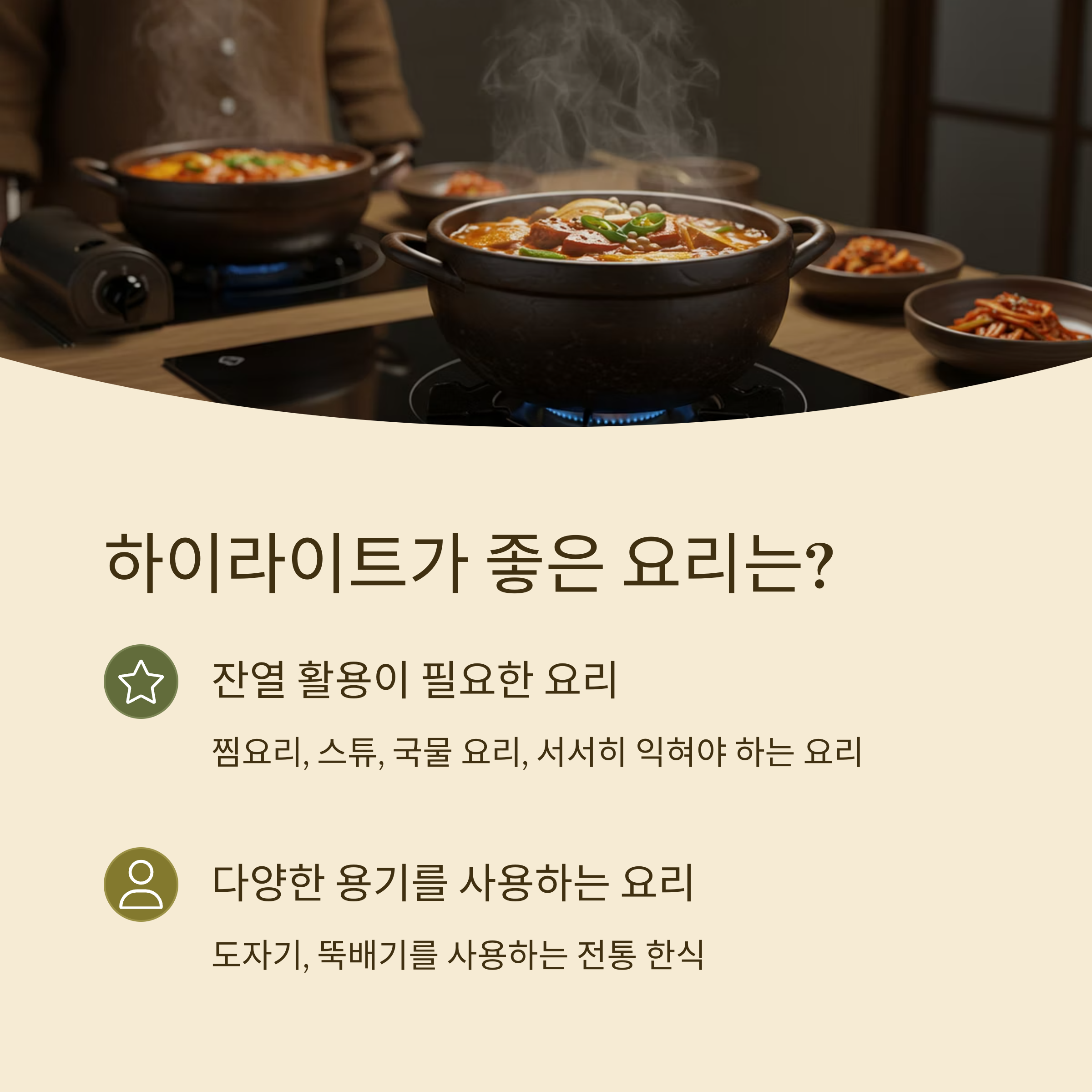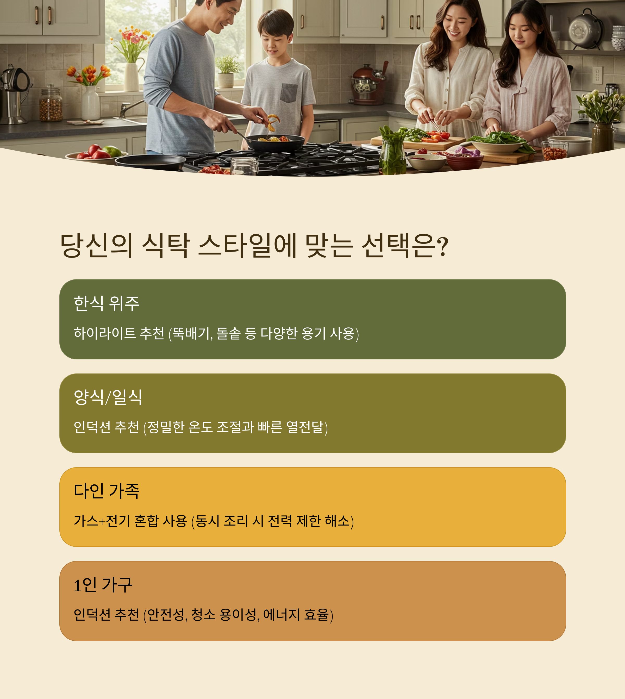 | 국·찌개, 간단 조리 위주 | 인덕션 | 빠르고 안전한 조리, 초벌에 유리 |