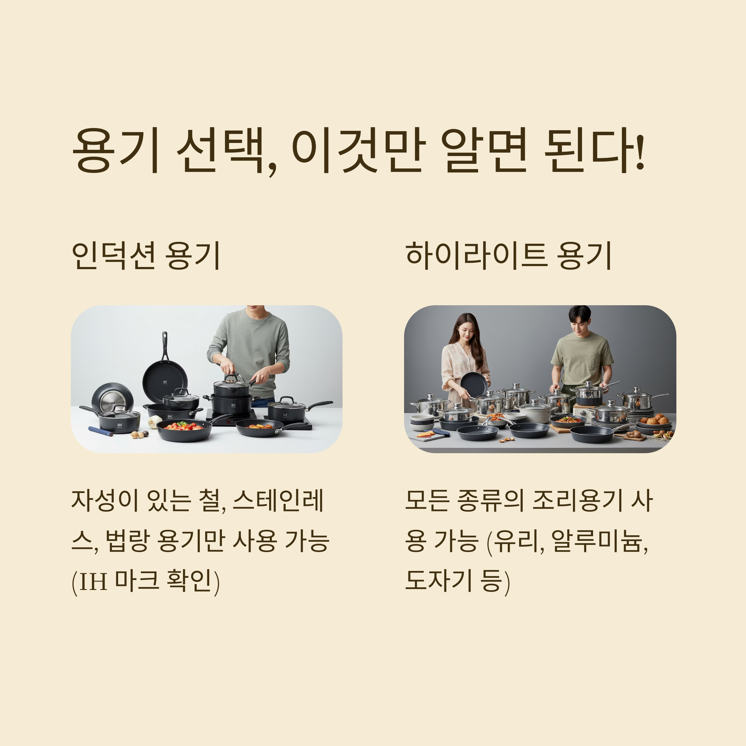 반면 하이라이트는 거의 모든 재질의 용기 사용이 가능하기 때문에