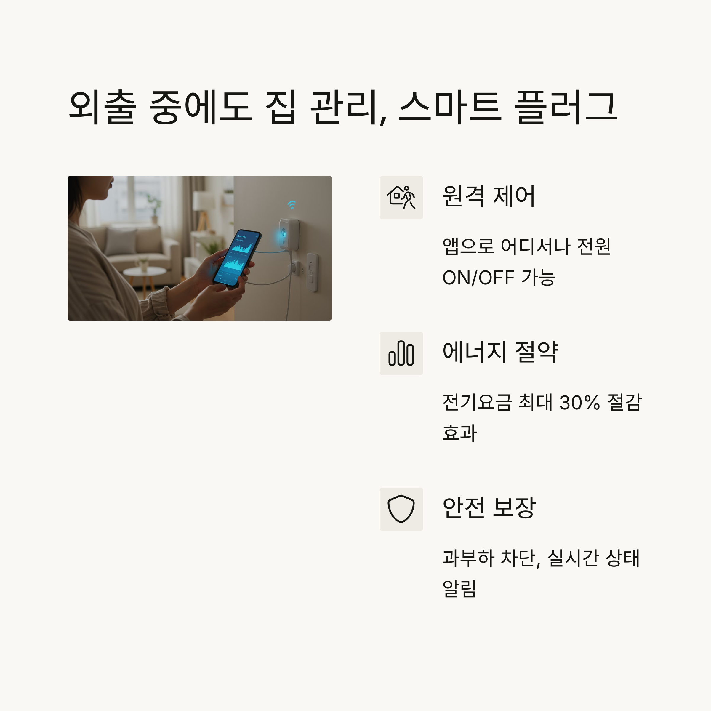- 스마트폰 앱으로 실시간 전원 ON/OFF 및 전력 사용량 체크 가능