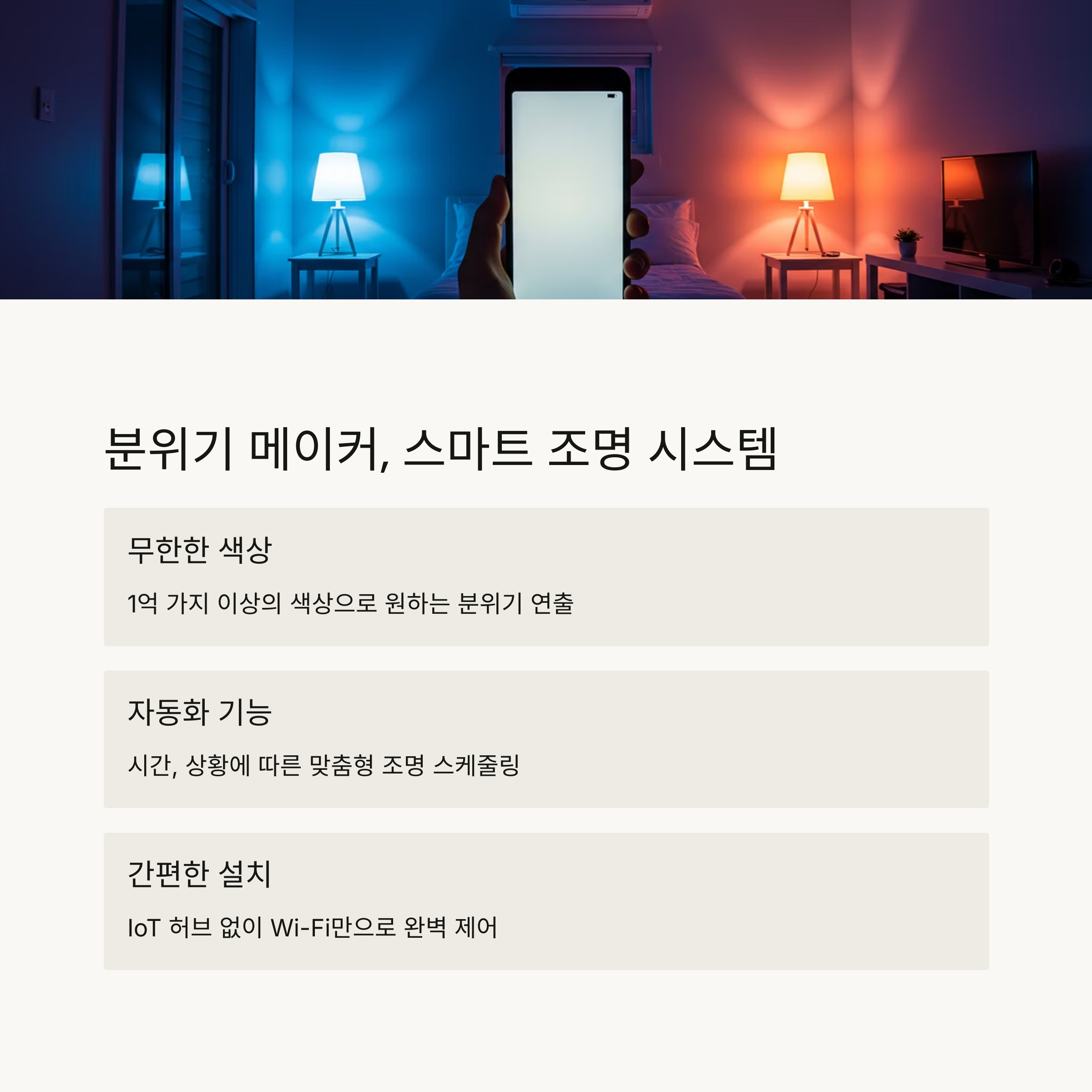 시간, 날씨, 음악, 활동에 따라 조도를 자동 조절해줍니다.