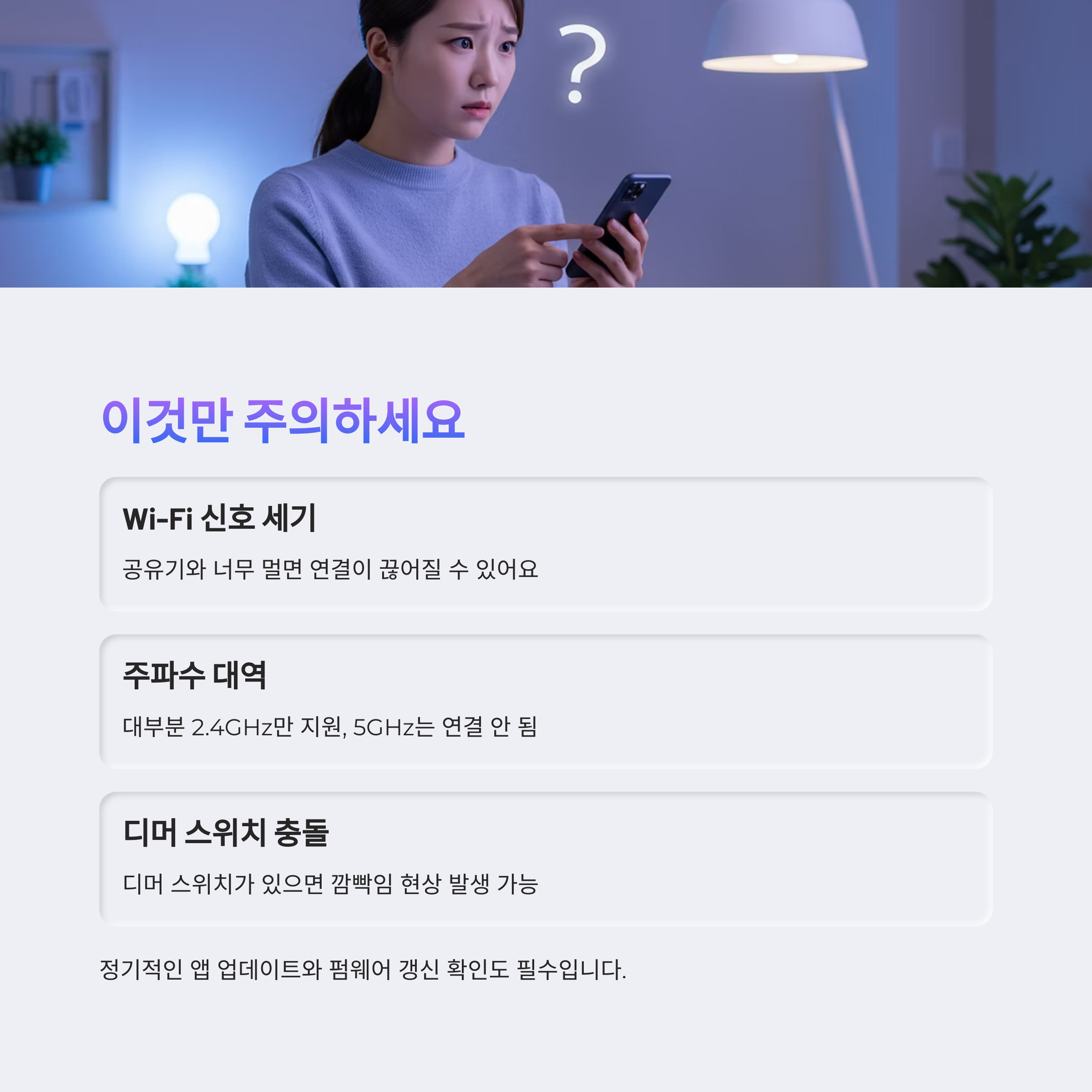- 디머 스위치와의 충돌: 디머 스위치가 있는 경우 깜빡이거나 연결이 불안정할 수 있음