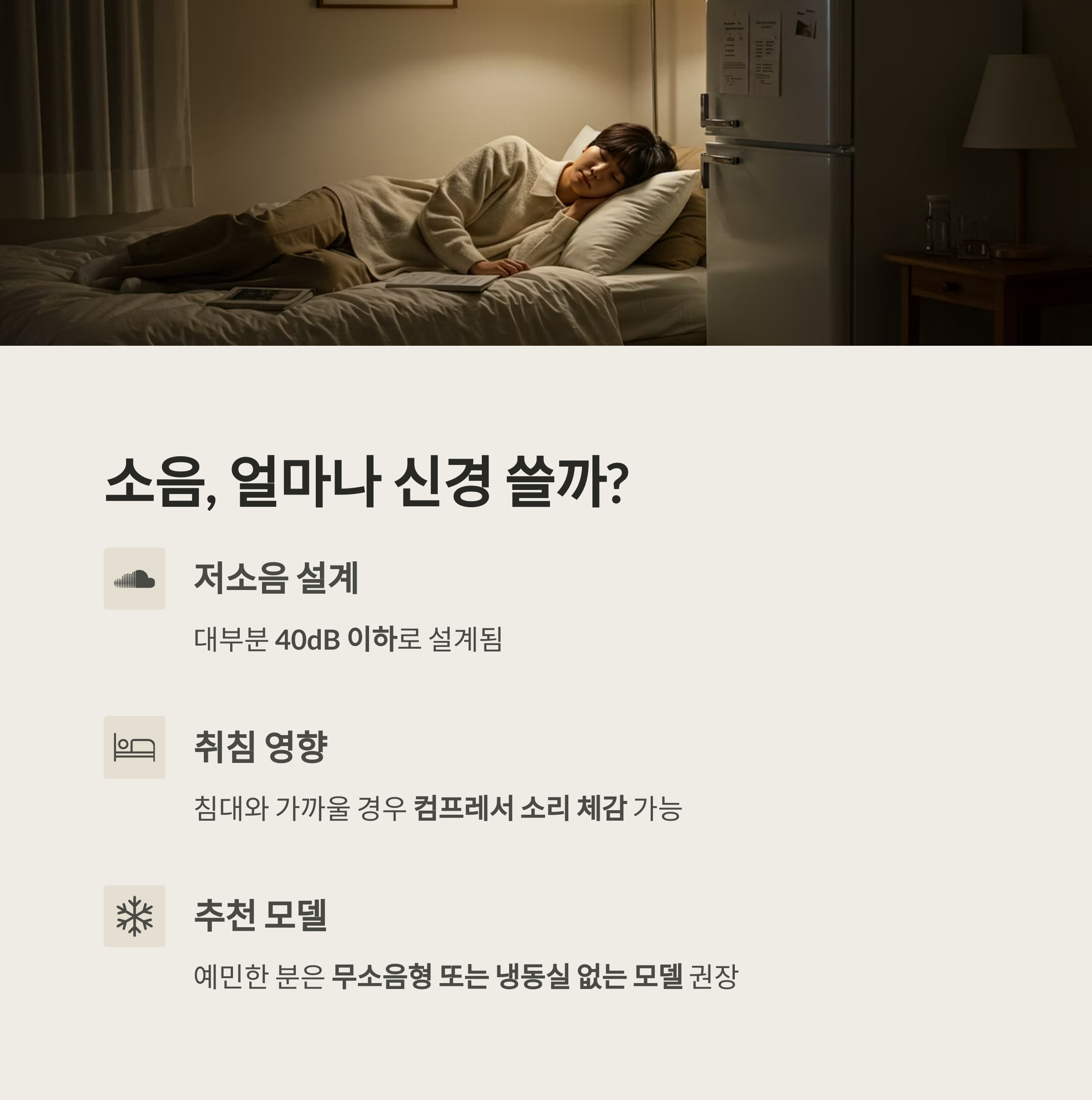 잠귀가 예민한 사람은 무소음형 제품이나 냉동실 없는 모델을 선택하는 것이 좋습니다.
