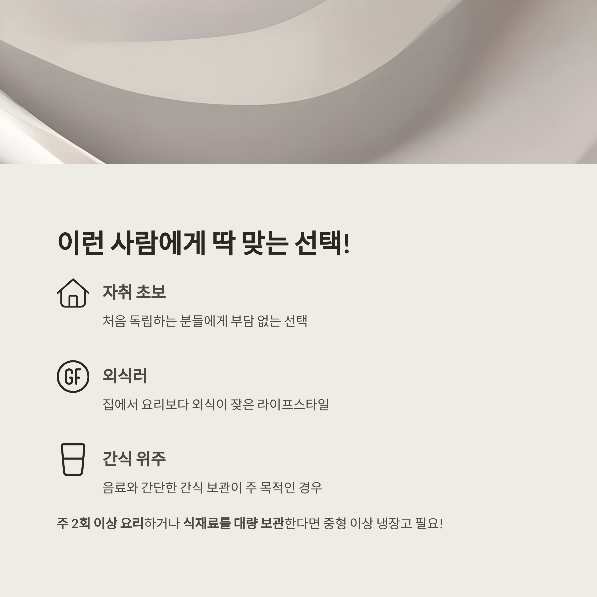 자취 초보, 외식이 잦은 사람, 음료·간식 보관 위주인 경우