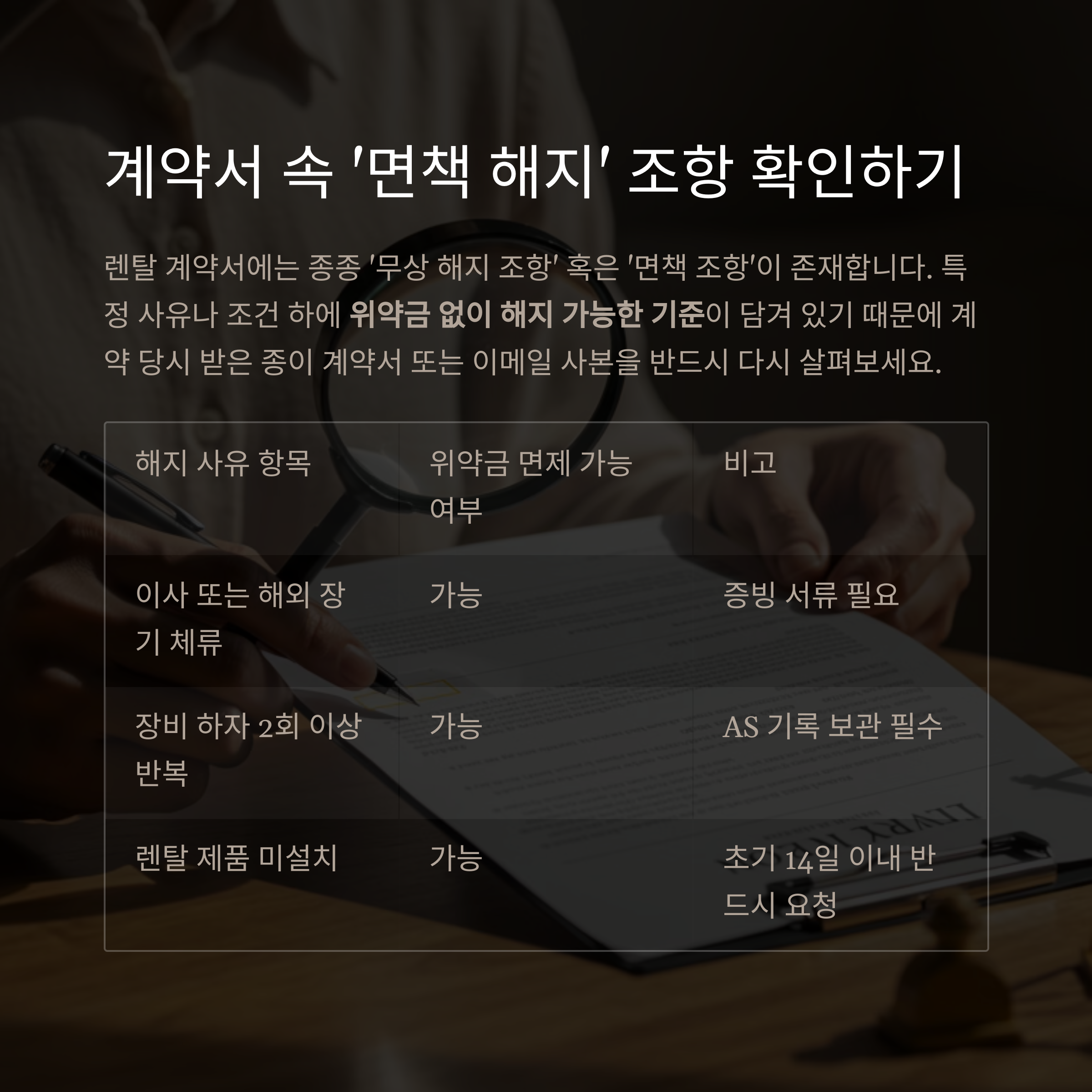 렌탈 계약서에는 종종 '무상 해지 조항' 혹은 '면책 조항'이 존재합니다