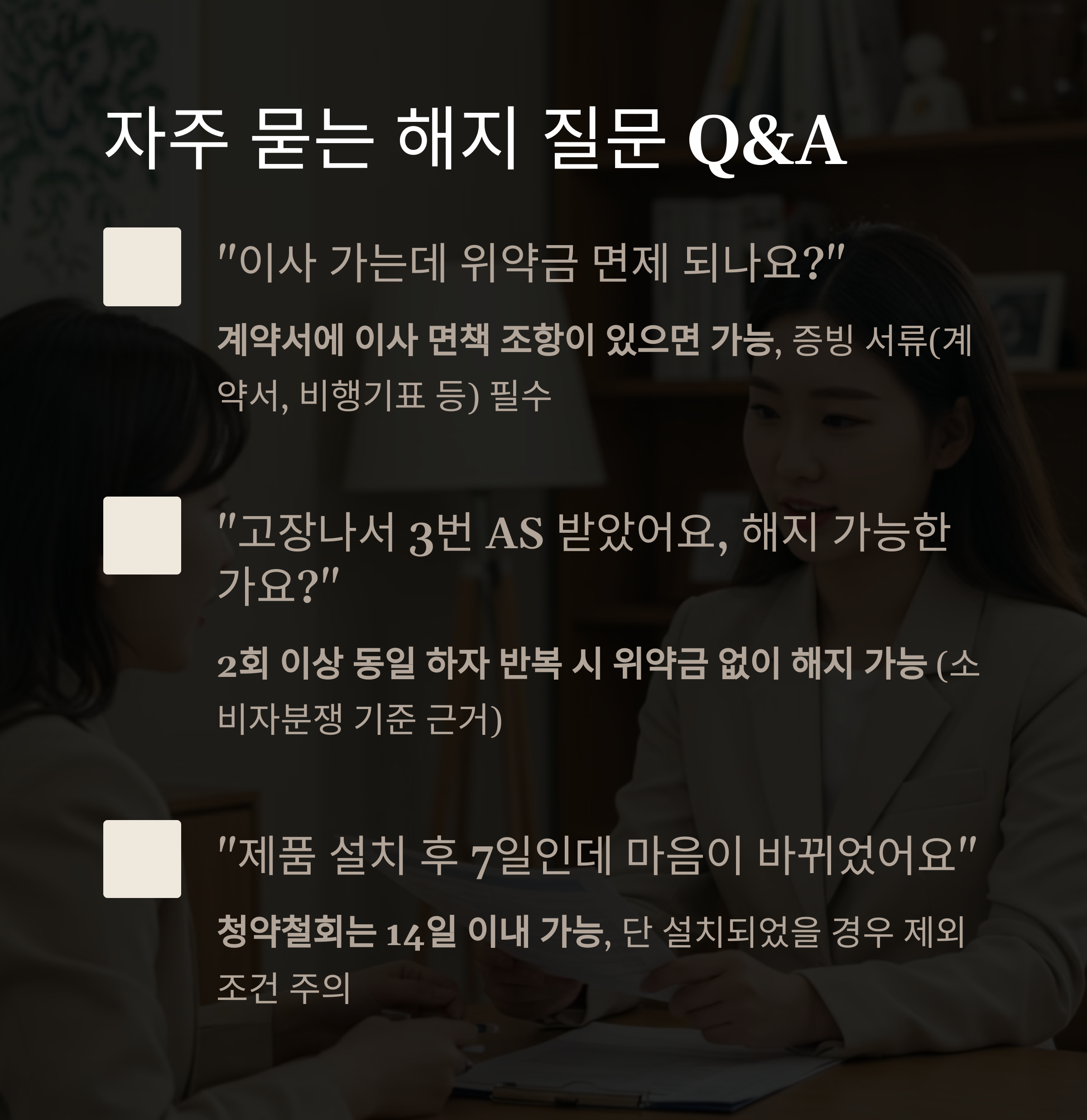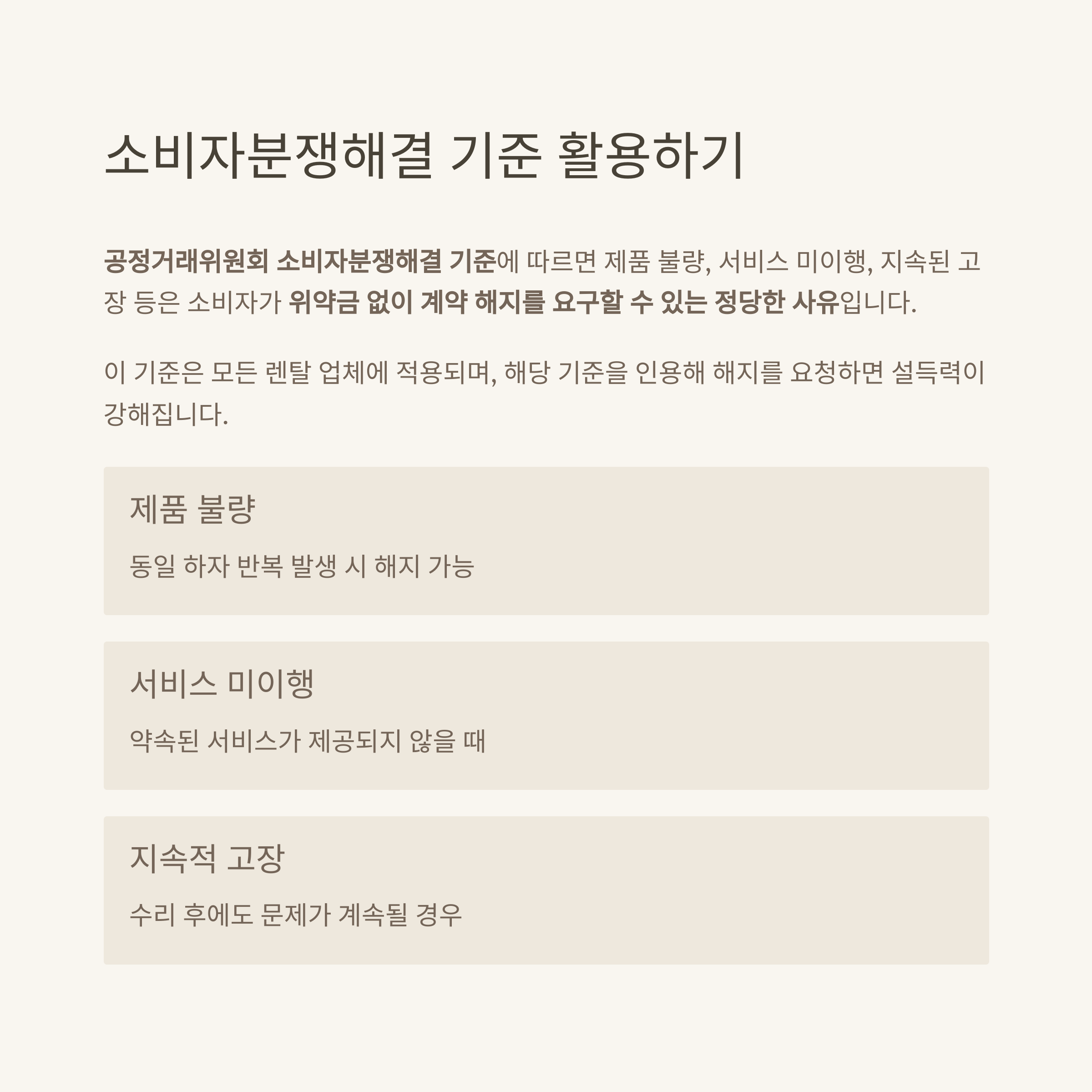→ 2회 이상 동일 하자 반복 시 위약금 없이 해지 가능 (소비자분쟁 기준 근거)