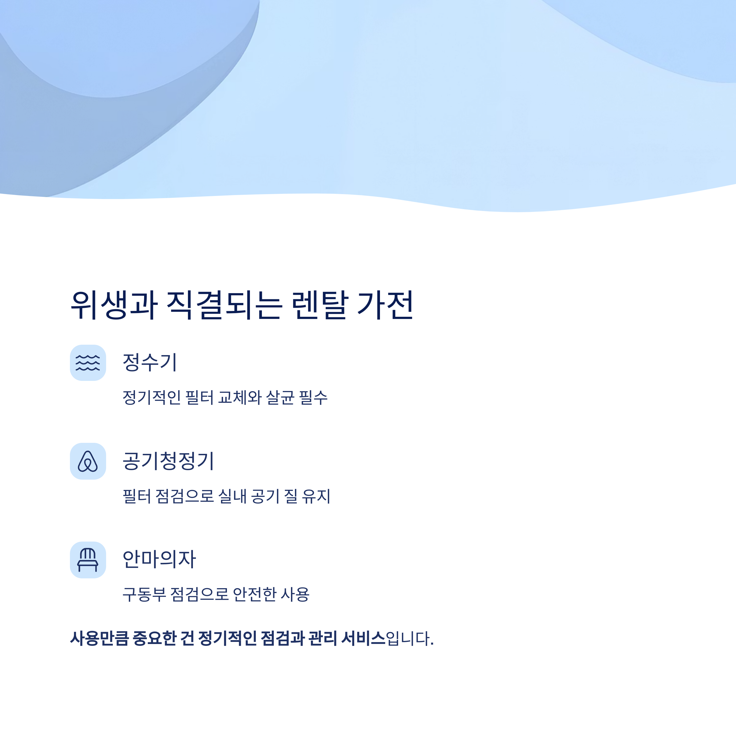정수기, 공기청정기, 비데, 안마의자 등 렌탈 제품은 대부분 위생과 직결되는 가전입니다