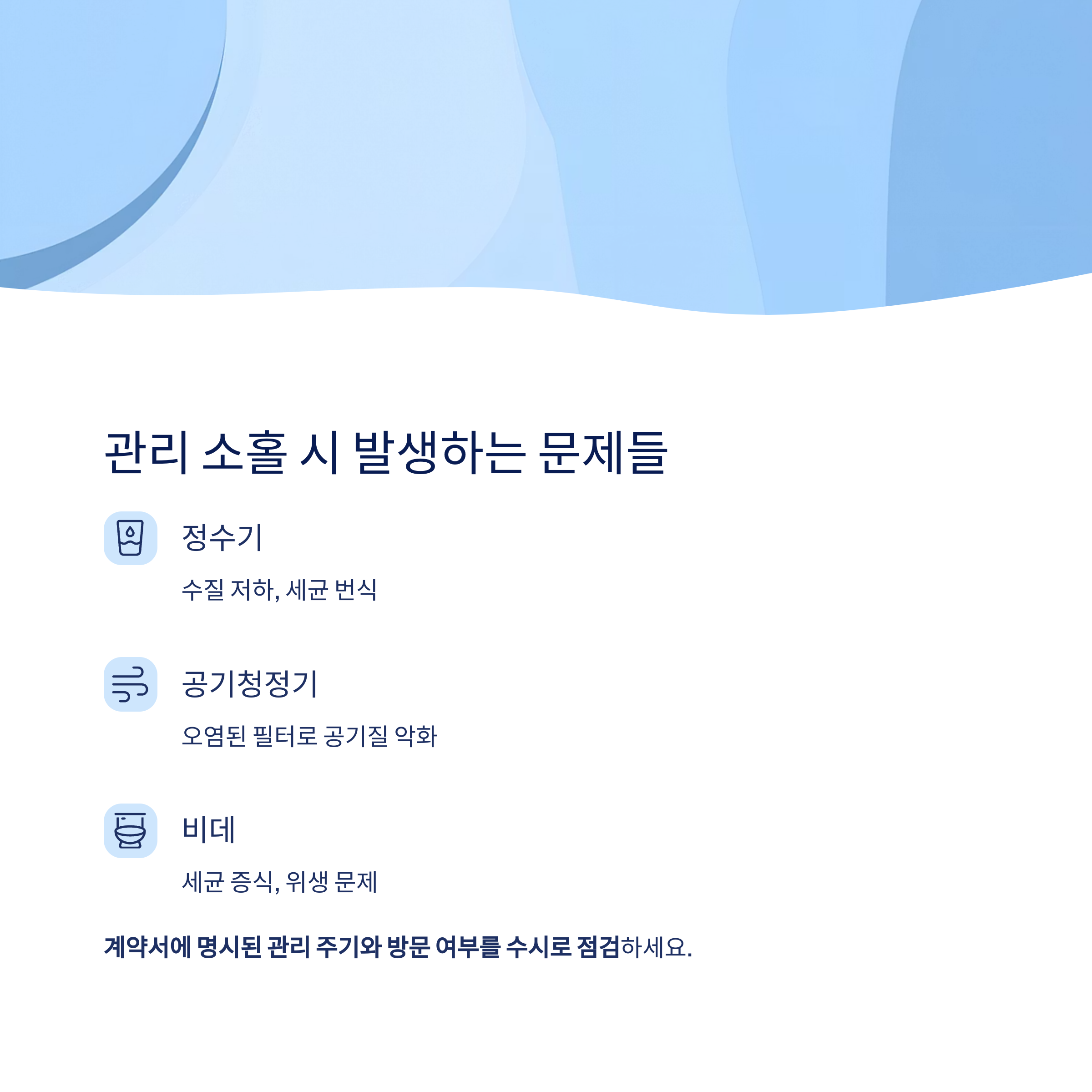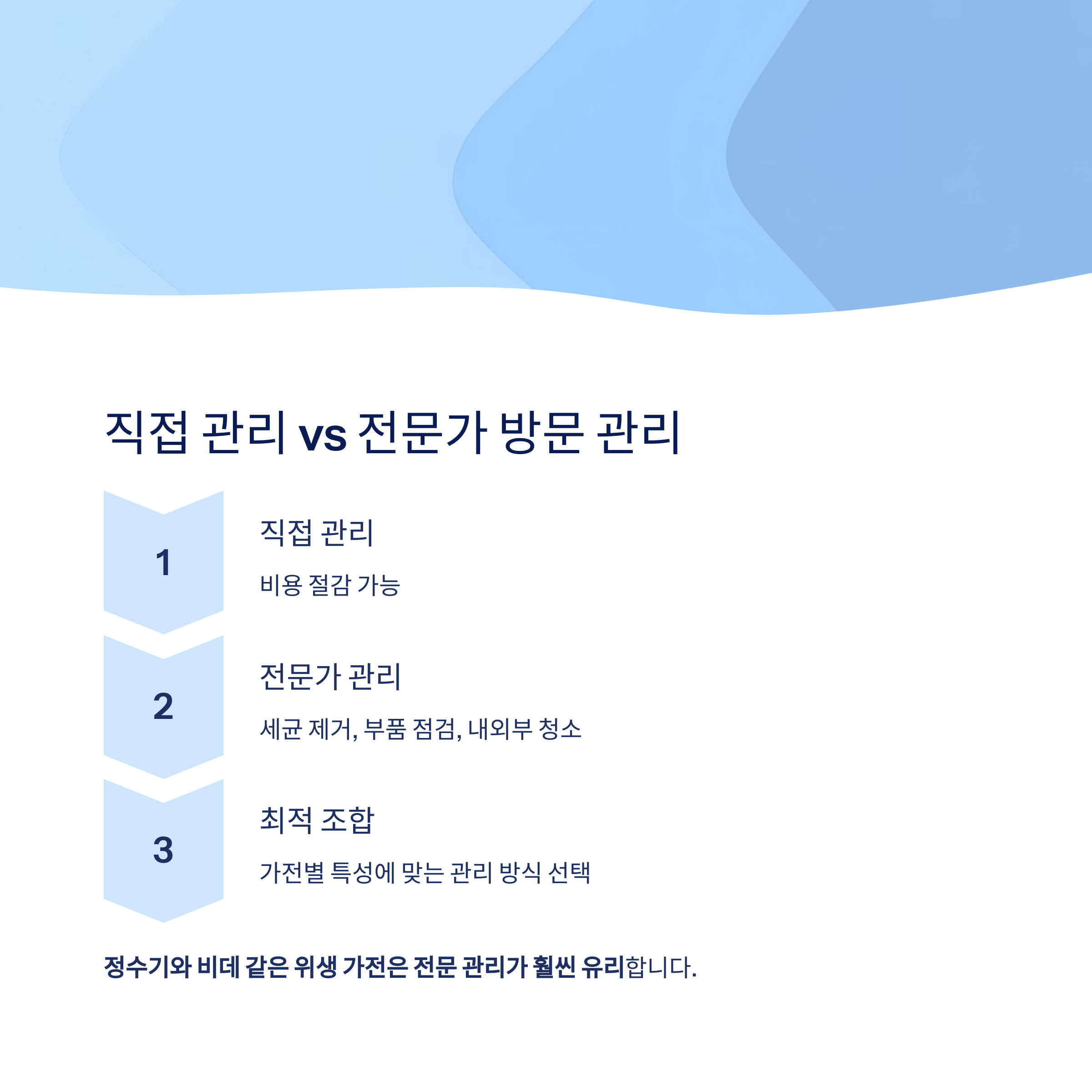 특히 정수기와 비데 같은 위생 가전은 전문 관리가 훨씬 유리합니다