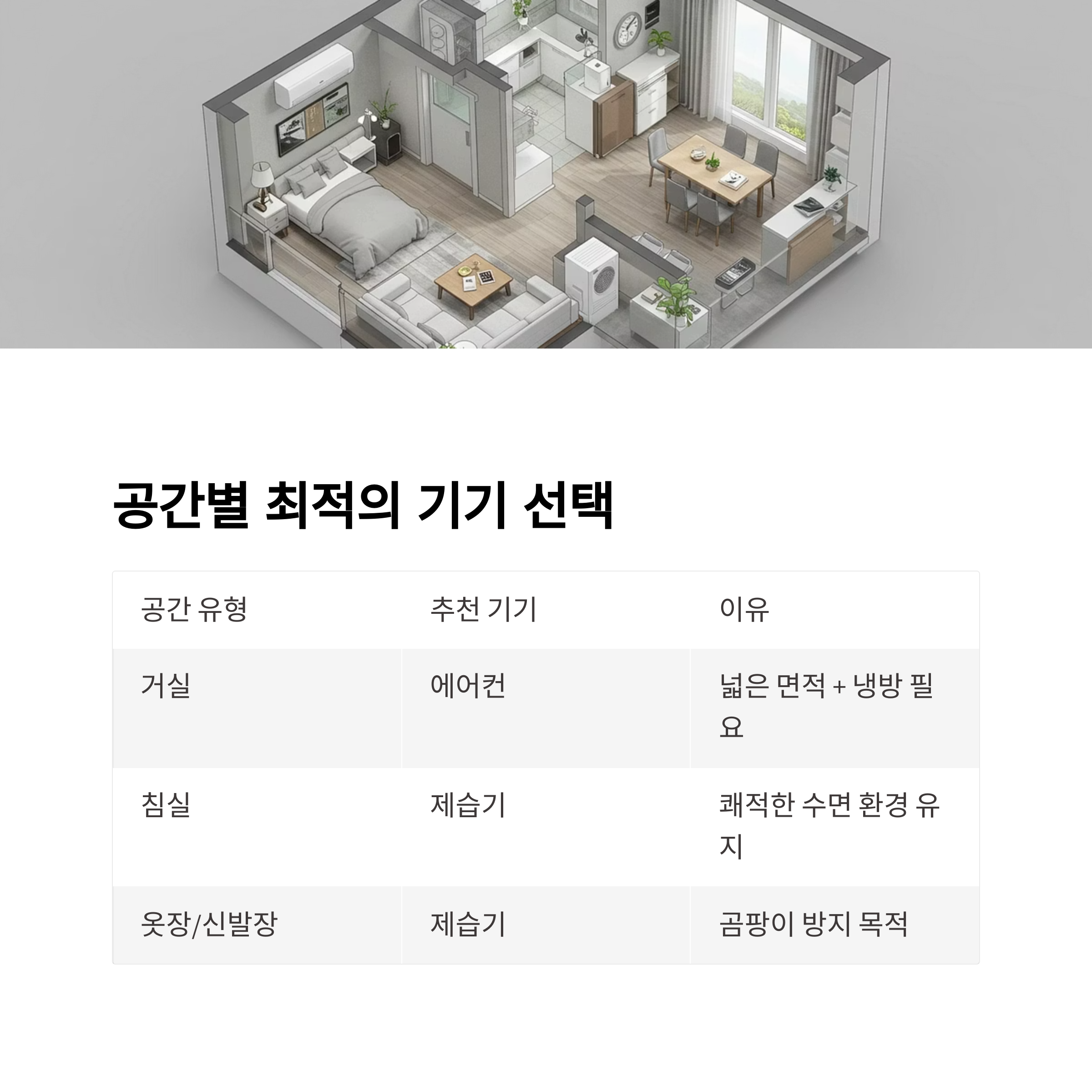 | 침실 | 제습기 | 습도 조절로 쾌적한 수면 환경 유지 |
