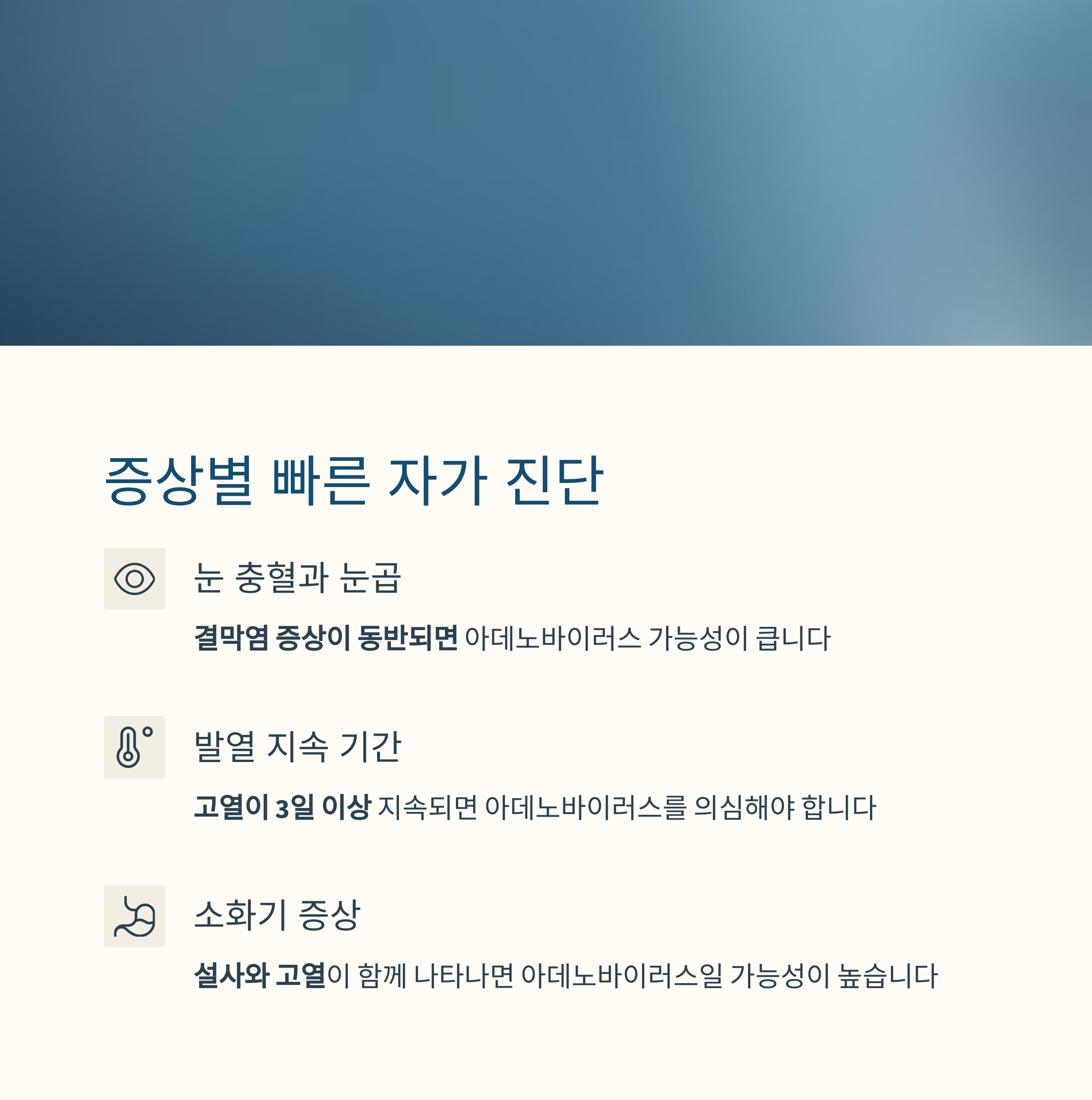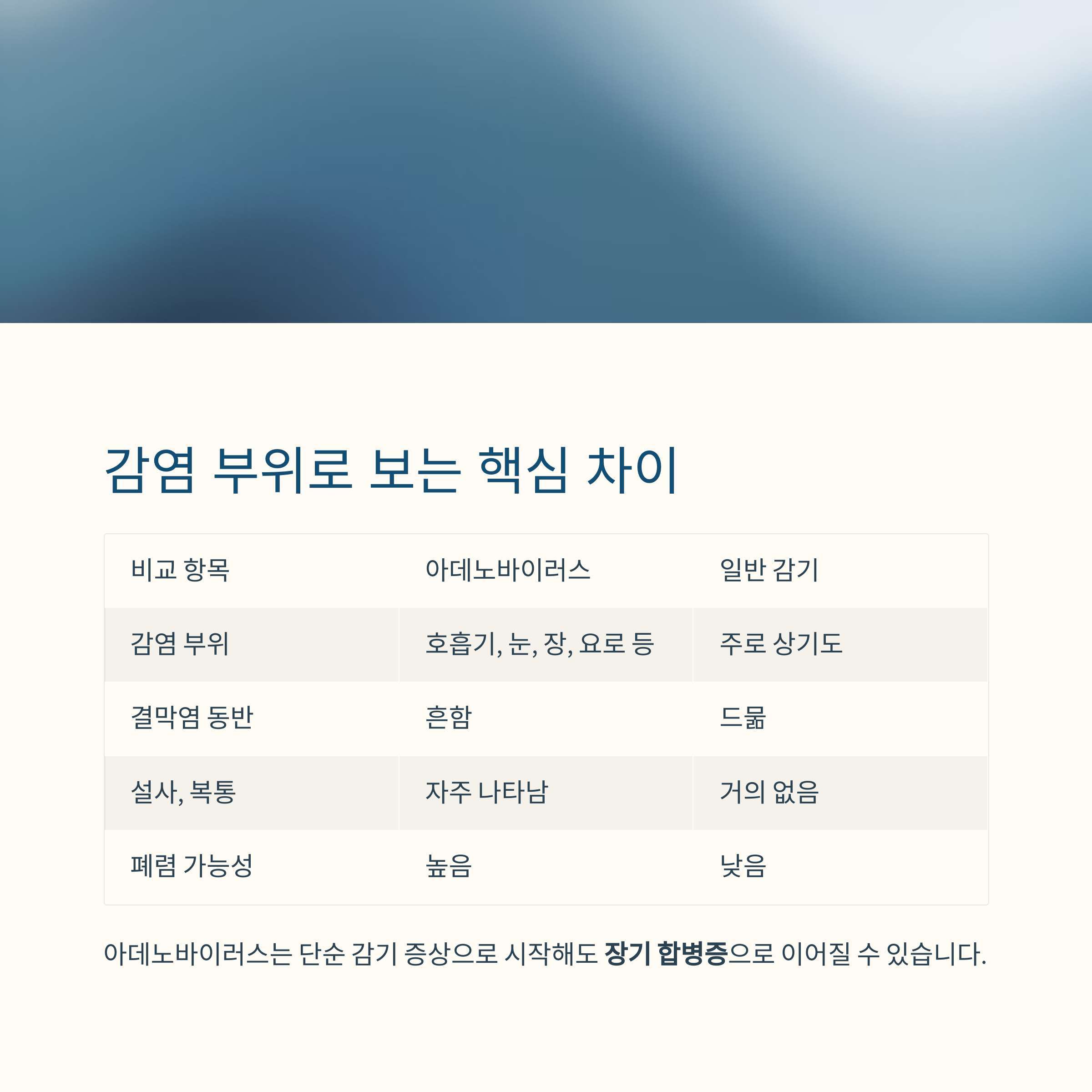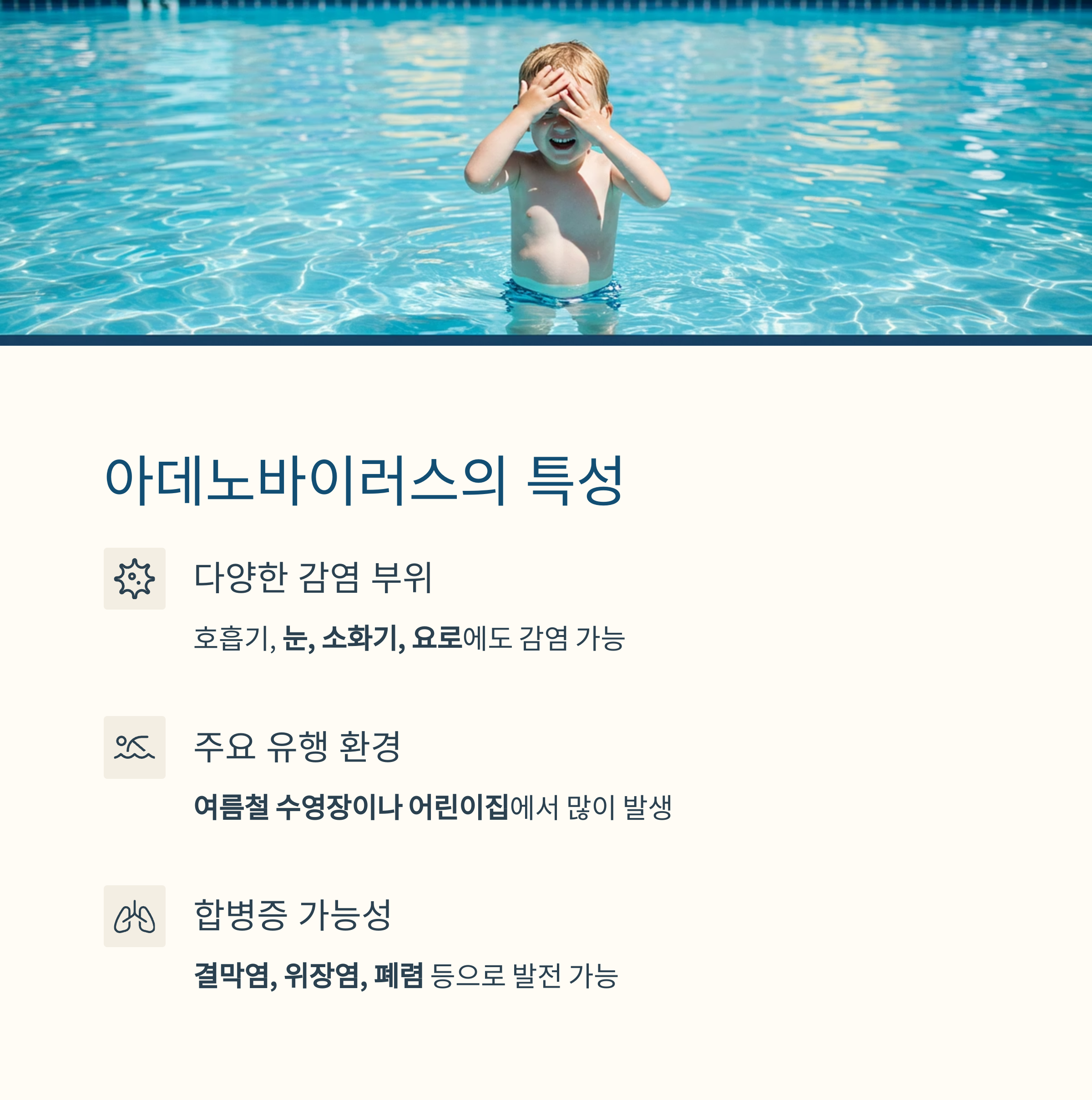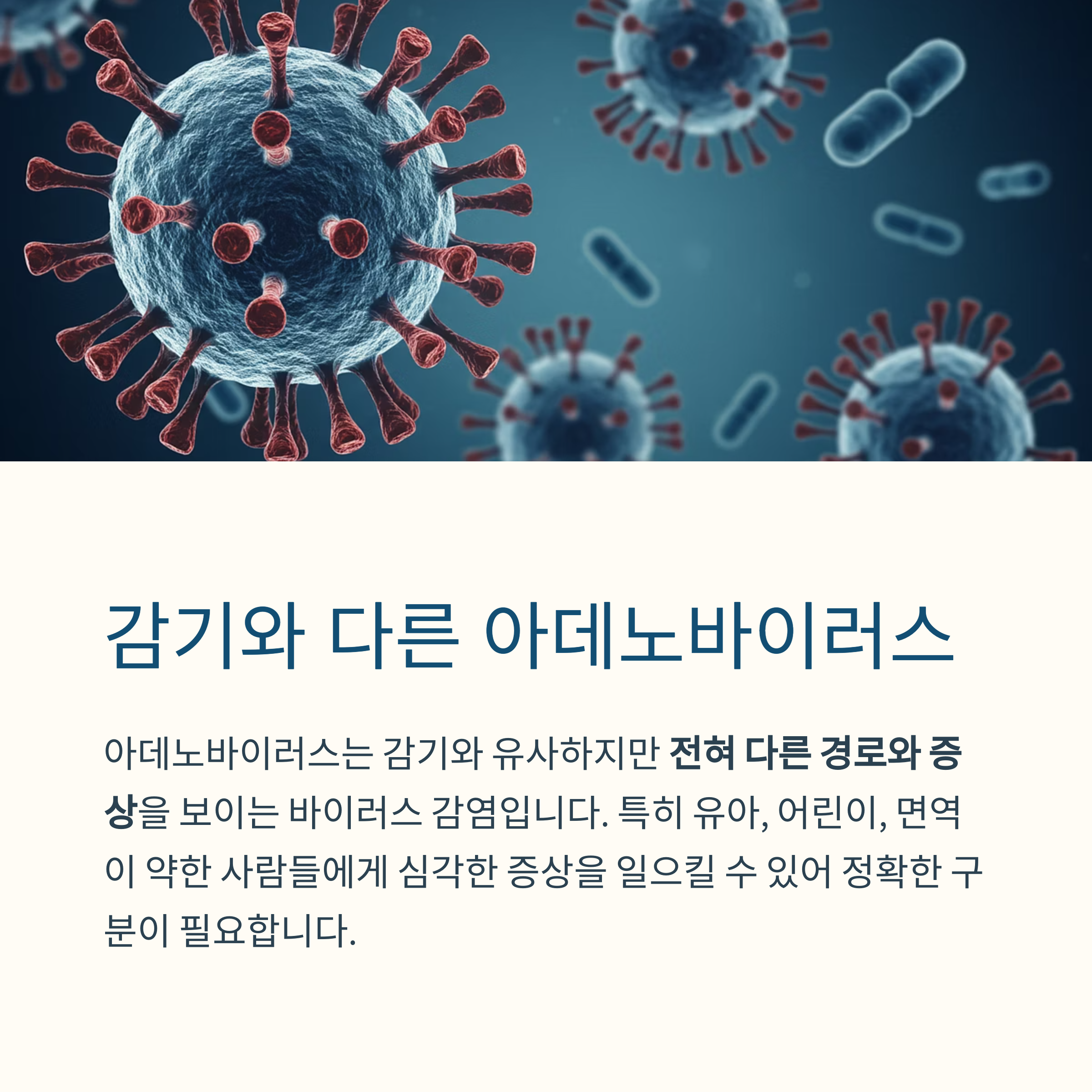 중요 포인트: 아데노바이러스는 단순한 감기 증상으로 시작해도 장기 합병증으로 이어질 수 있어 주의가 필요합니다.