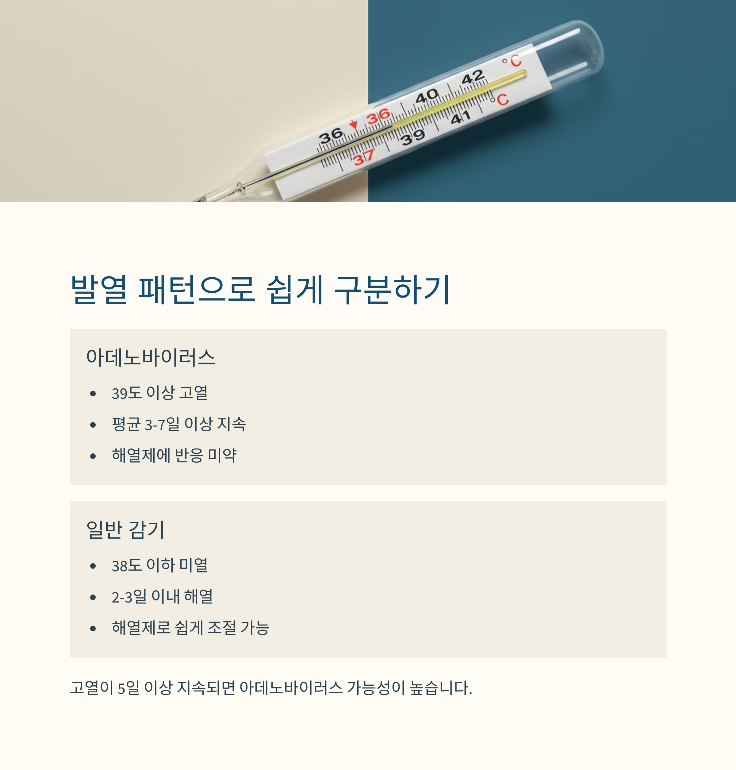 → 고열이 5일 이상 지속되면 아데노바이러스 가능성이 높습니다.