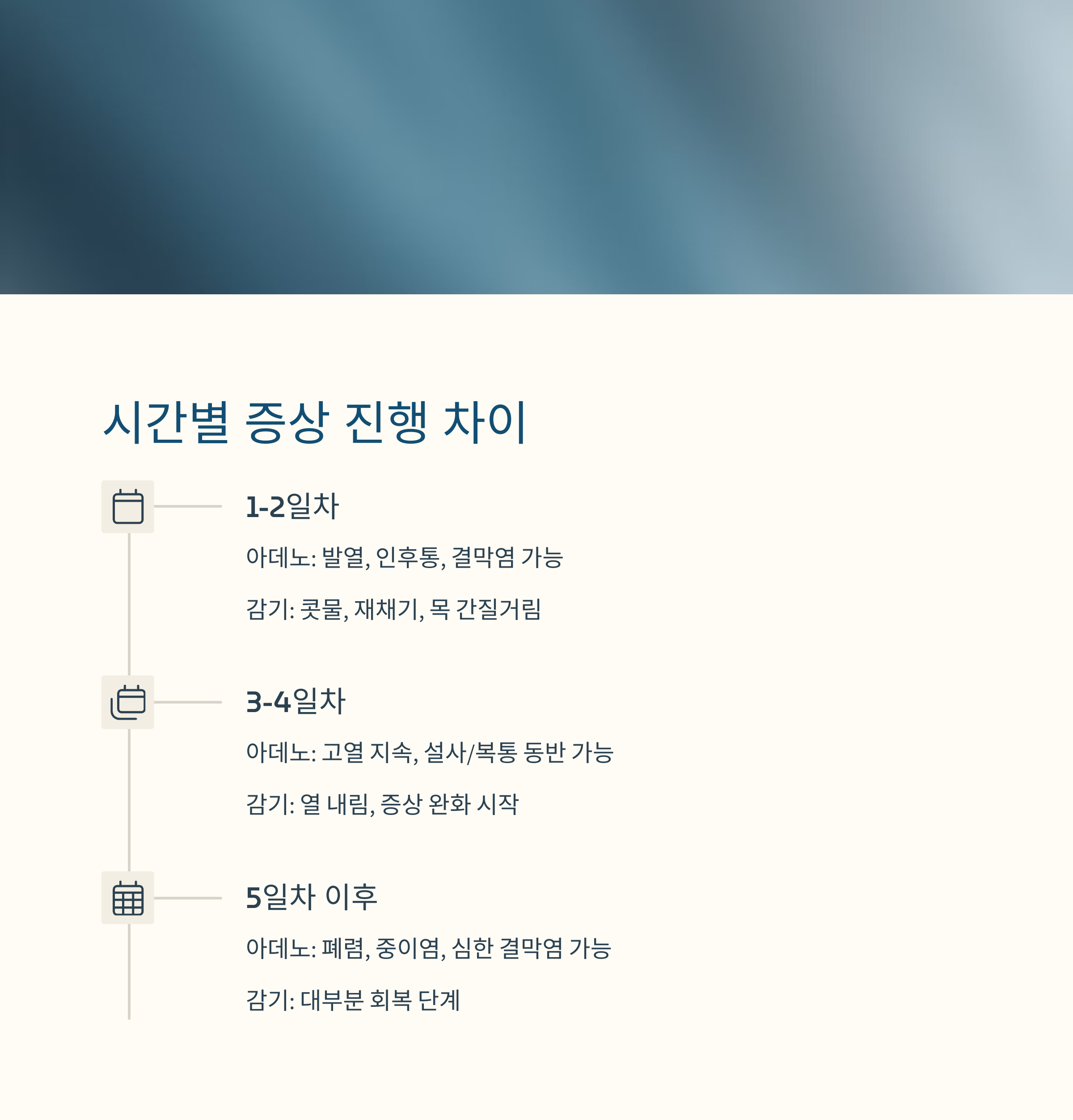 | 1~2일차 | 발열, 인후통 시작, 결막염 동반 가능 | 콧물, 재채기, 목 간질간질 |