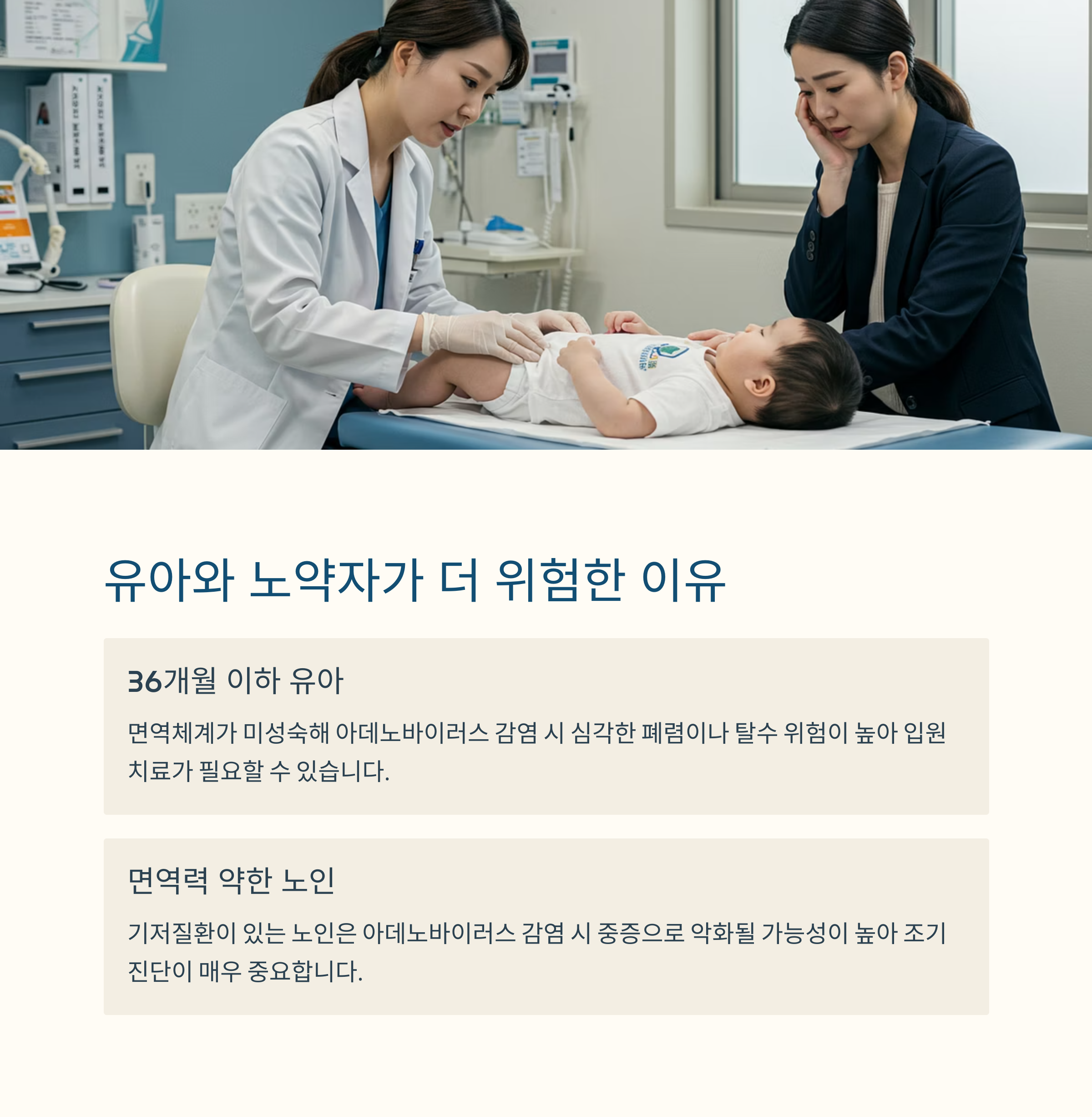 면역력이 약한 노인, 기저질환자도 아데노 감염 시 중증으로 악화될 수 있습니다.
